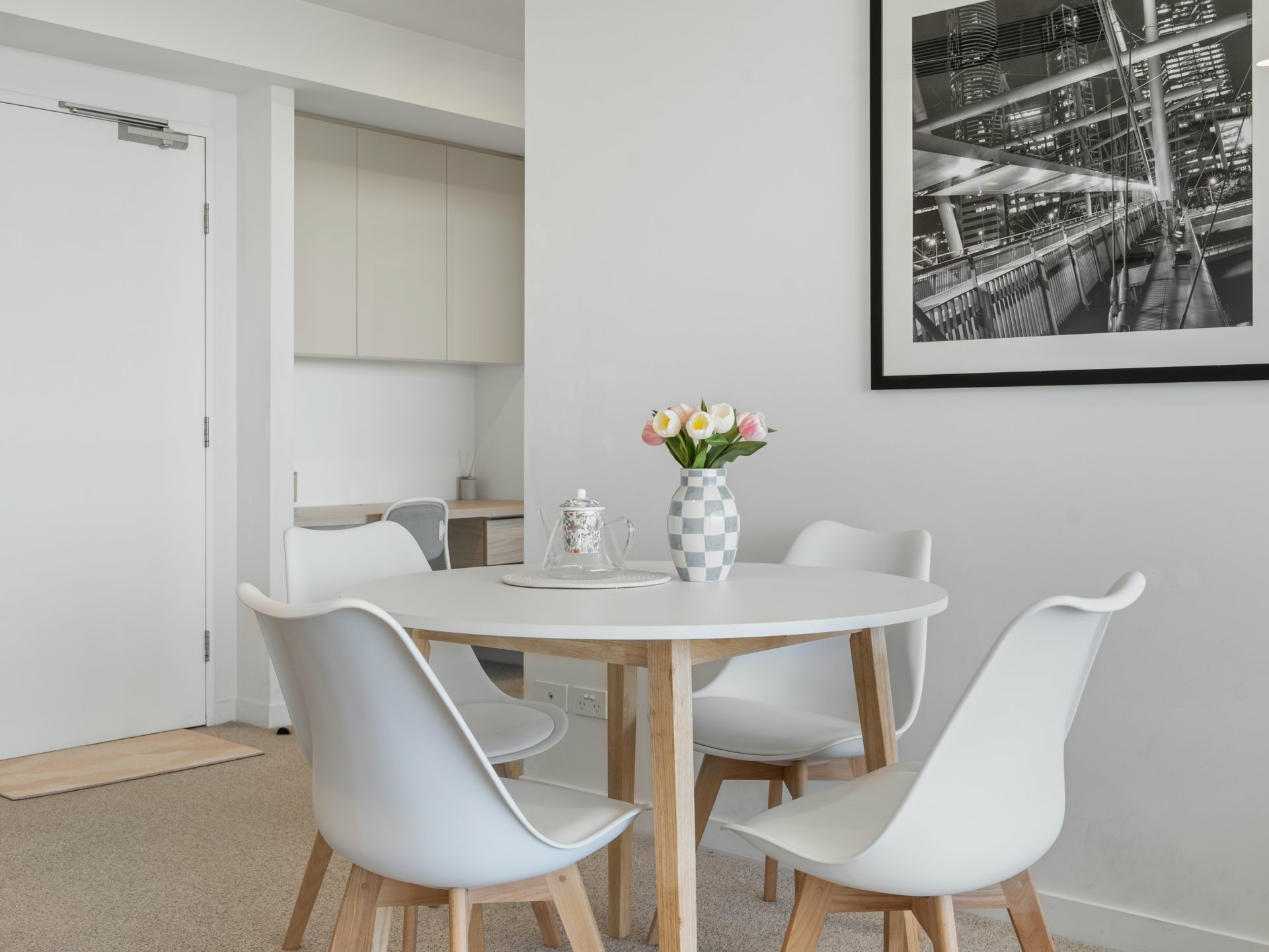 - Chic kitchen with electric mod cons, carpeted living/dining + built-in study nook