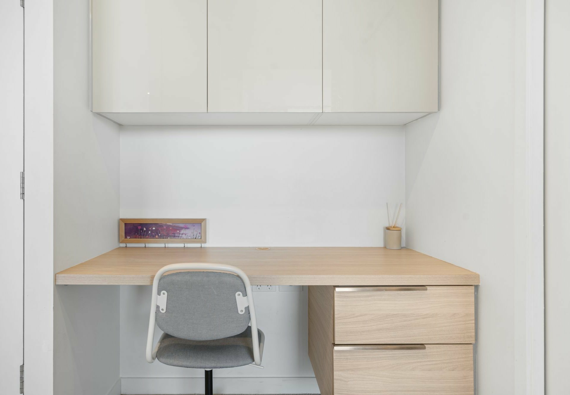 Next door, the carpeted master-size bedroom also opens onto the balcony and benefits from a space-savvy wall of mirrored sliding door robes. There's a handy study nook on the way in, pre-equipped with a desk, drawers and overhead storage, and the nearby bathroom is attractively full-height tiled with a glass-enclosed shower.