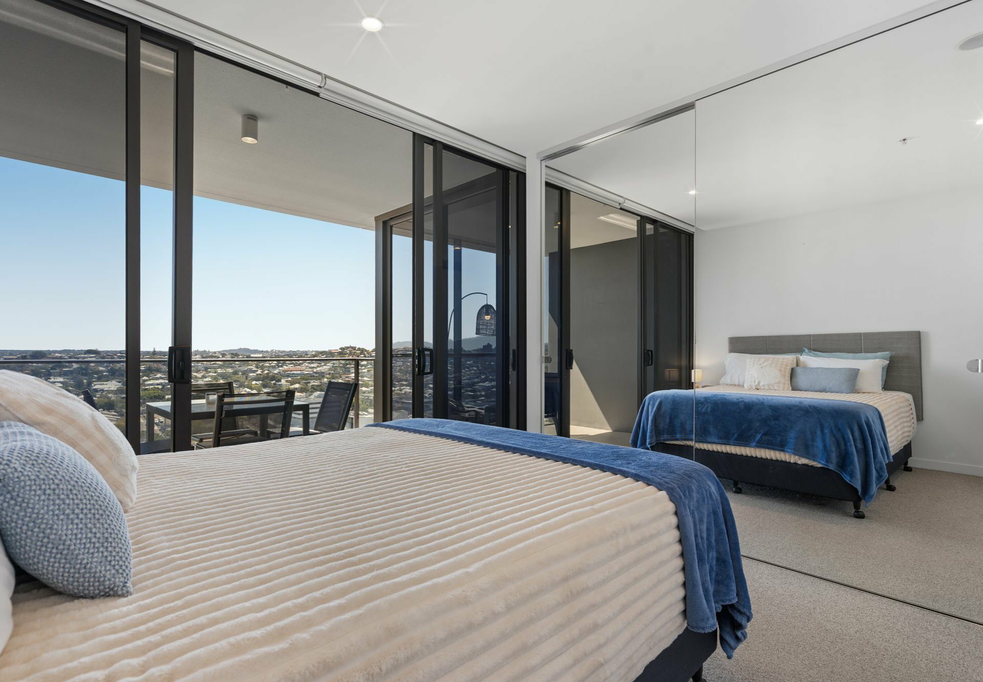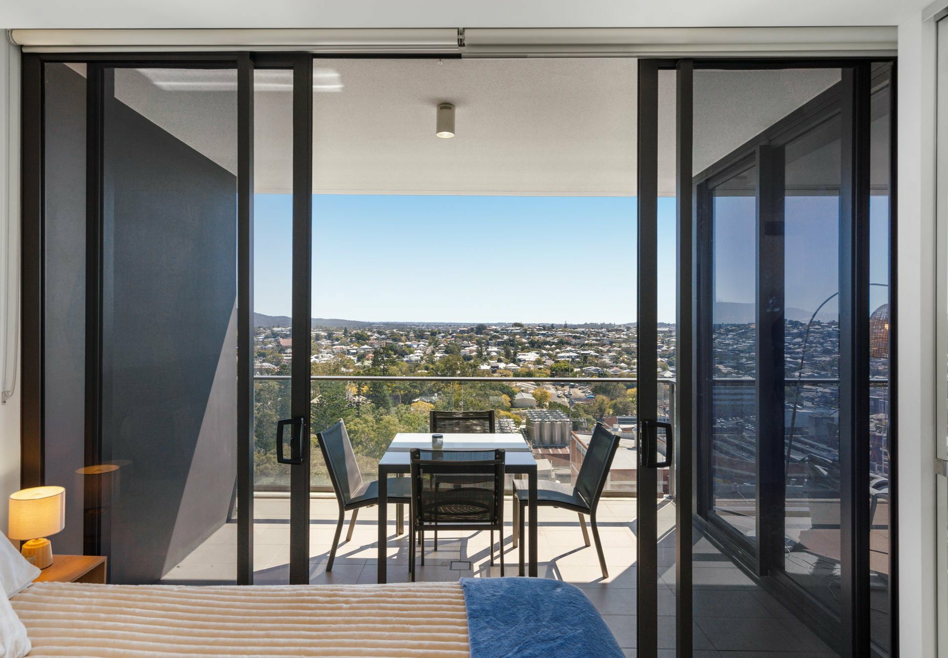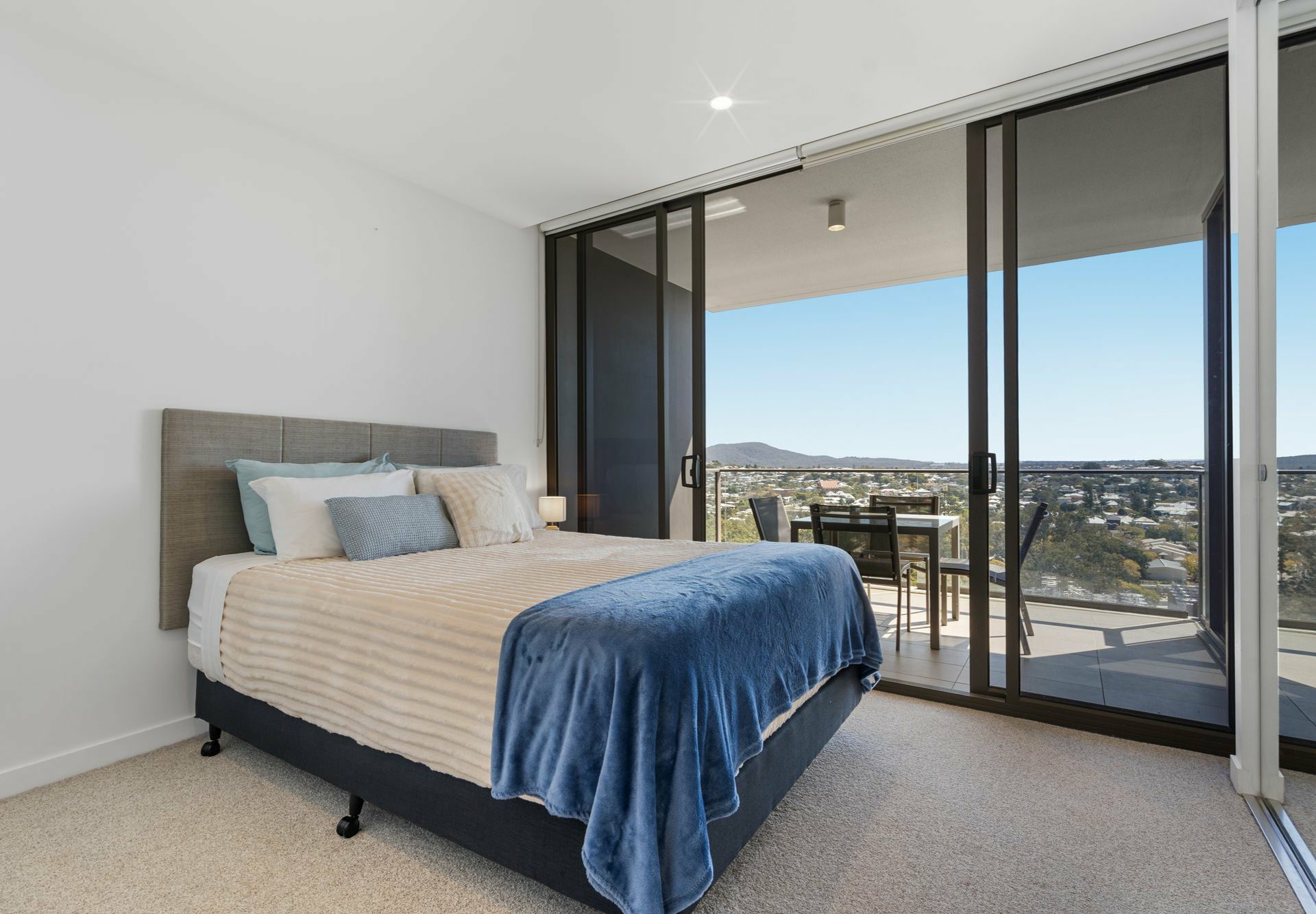 - Full-height windows in living hub & carpeted bed, both with sliders to glass-framed balcony