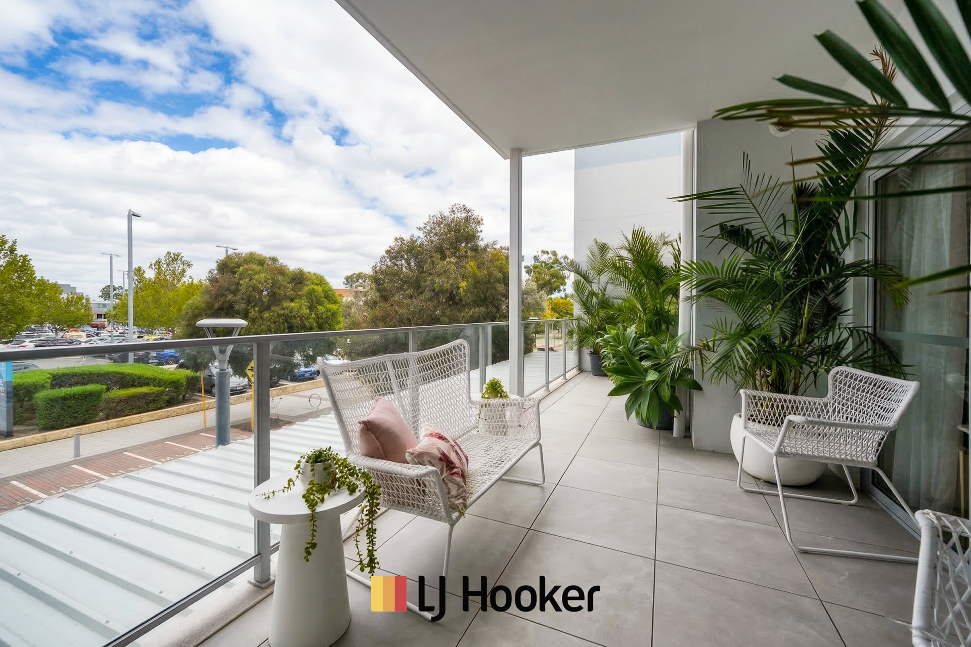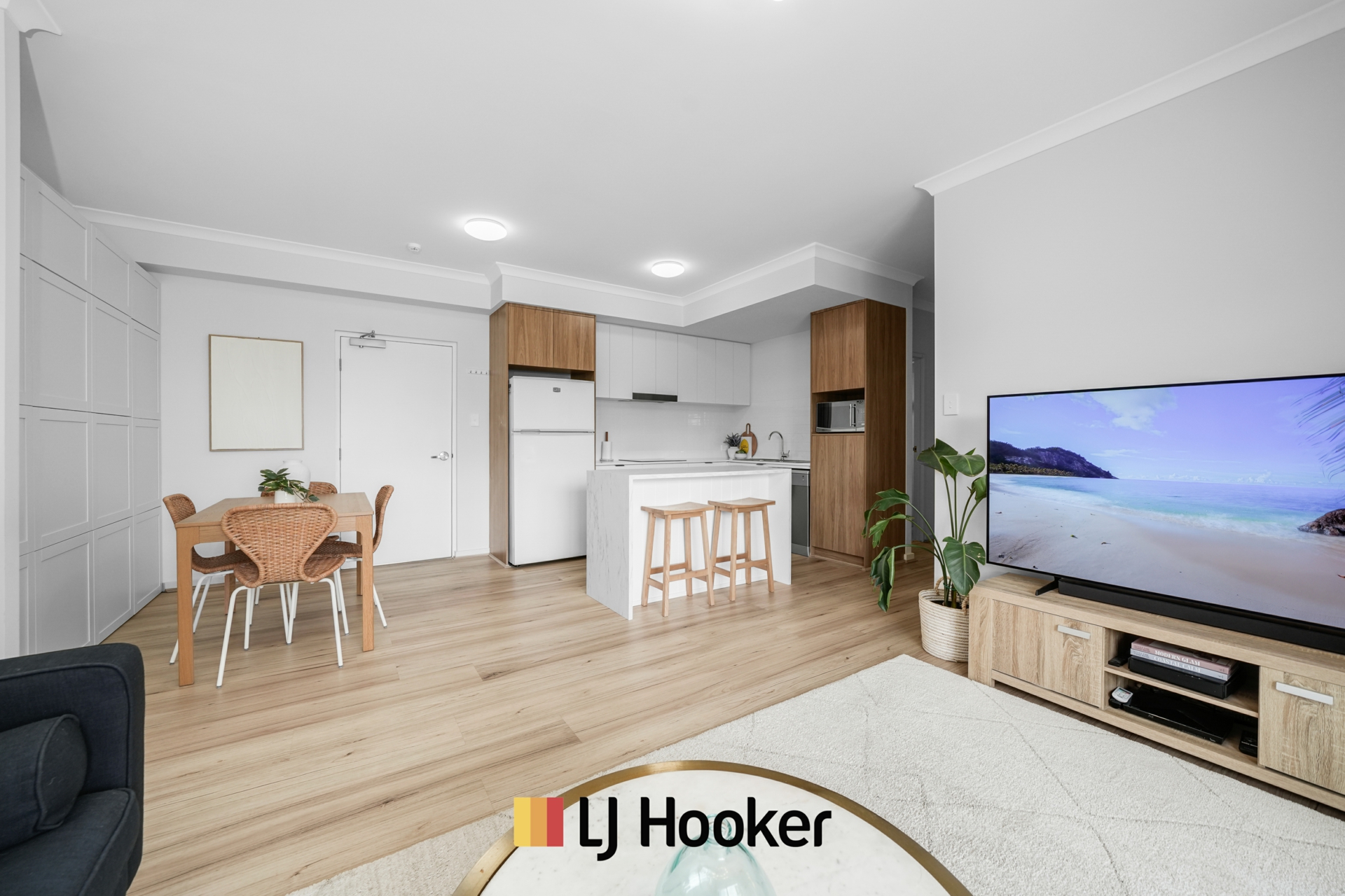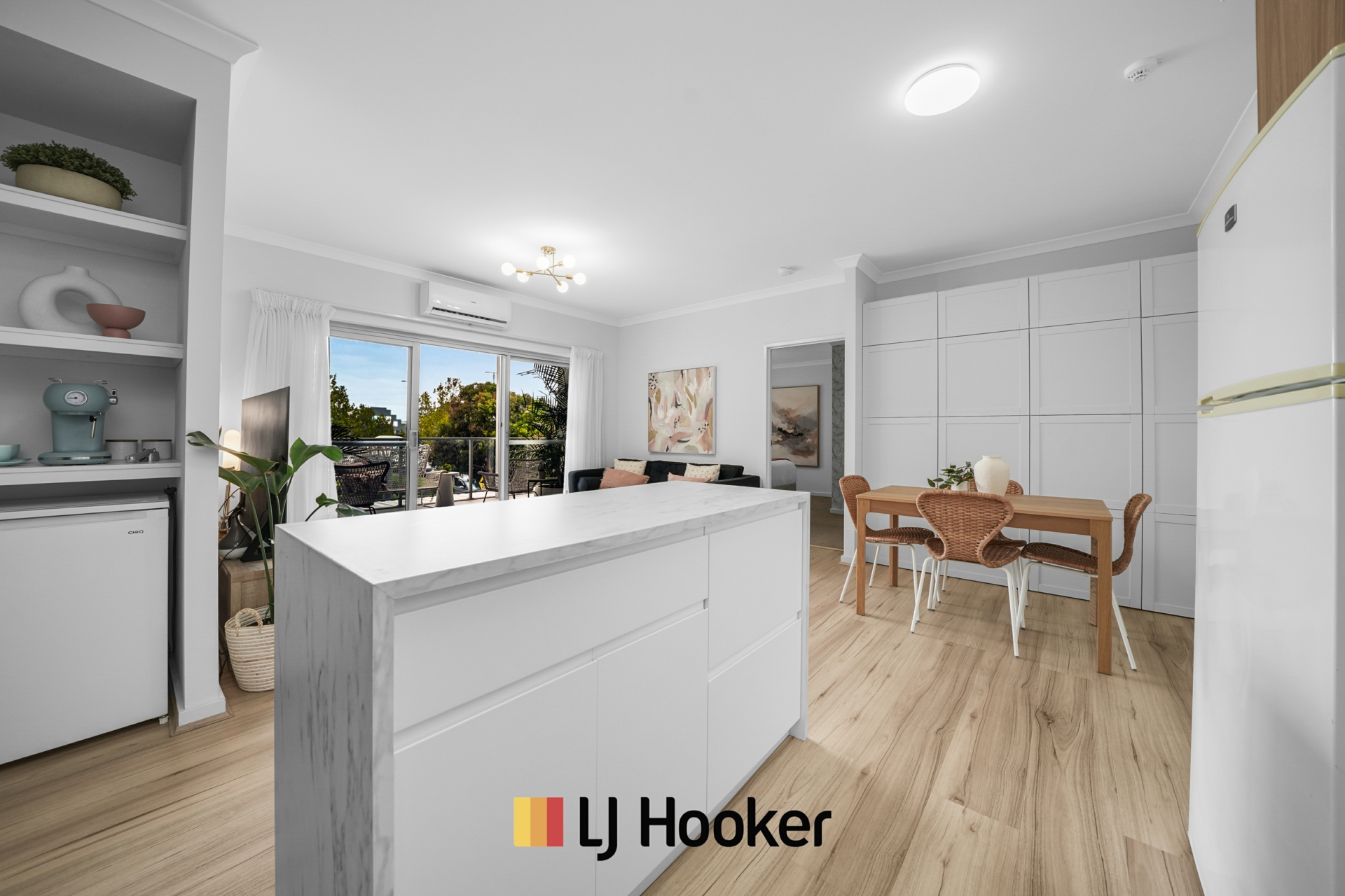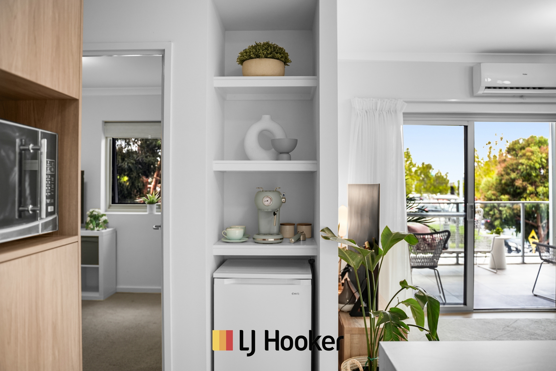 Inside, the apartment features high ceilings and light-filled interiors, creating a spacious and airy atmosphere. This particular apartment stands out as the only upgraded unit in the complex, offering enhanced finishes and additional storage throughout. The open-plan living and dining area flows seamlessly into a contemporary kitchen fitted with stone benchtops, stainless steel appliances, and two integrated wine racks, combining practicality with style.