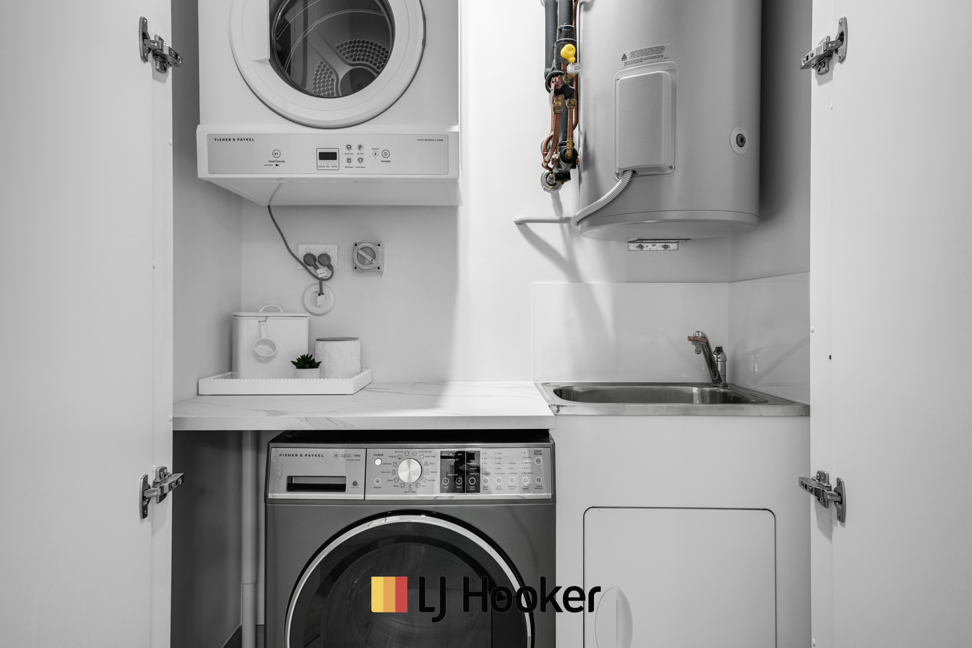 Both bedrooms are generously sized and include floor-to-ceiling mirrored built-in robes, while the modern bathrooms are thoughtfully designed with large showers and quality finishes. Additional features include split-system air conditioning, a space-saving European laundry with dryer, and an abundance of storage including a larger-than-usual storeroom.