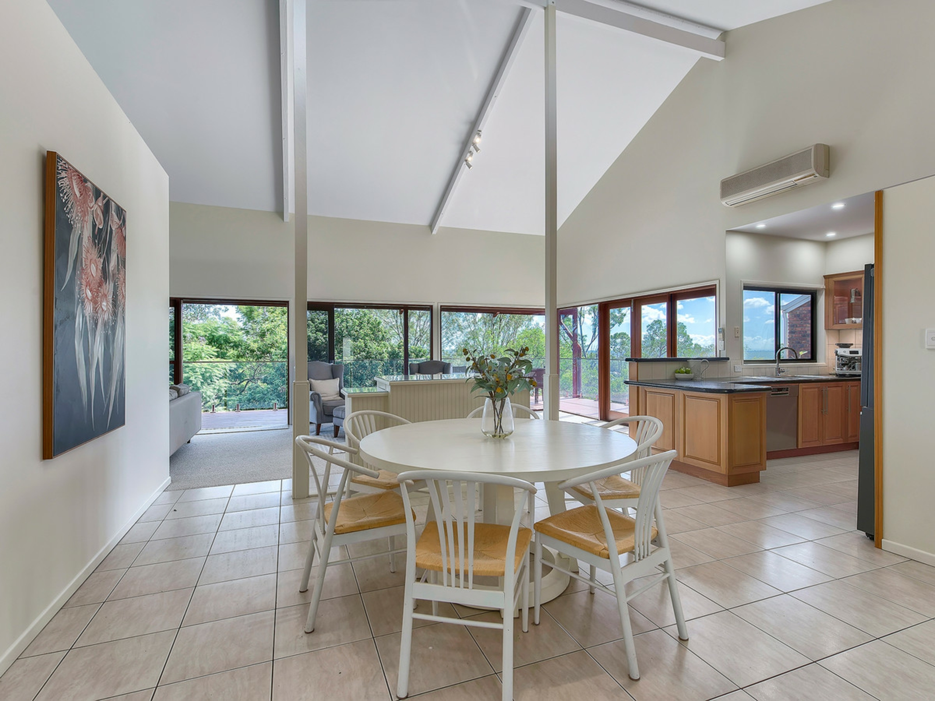 - Open-plan living and dining with high-pitched ceilings.