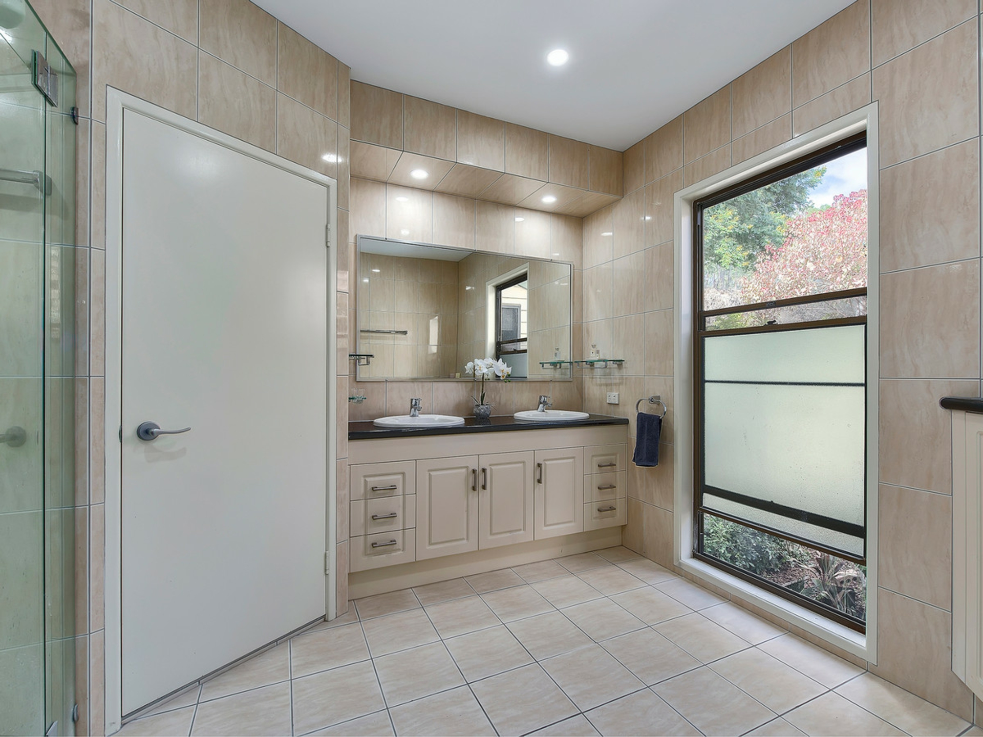 - Ensuite featuring floor-to-ceiling tiles and dual vanities.