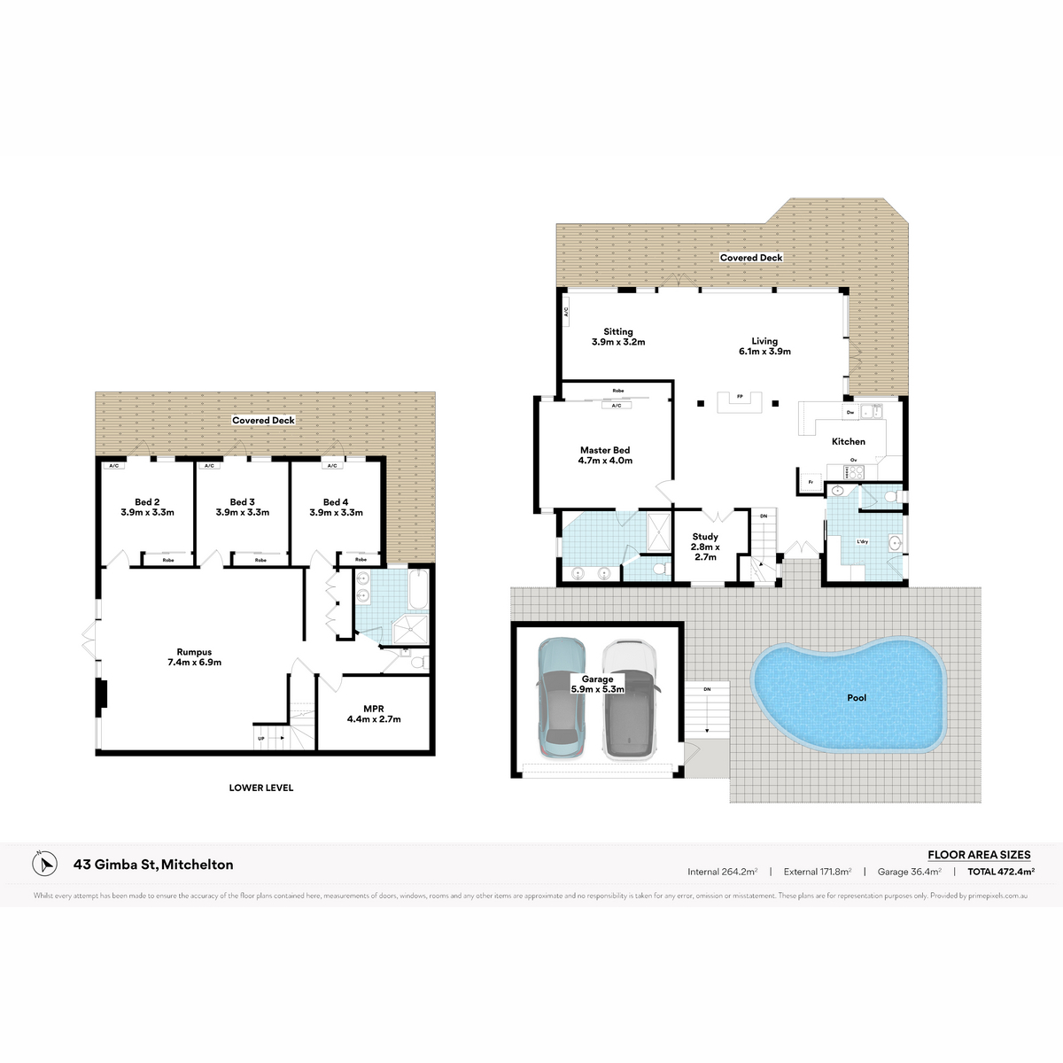 - Covered timber deck wrapping the eastern side of the lower level.