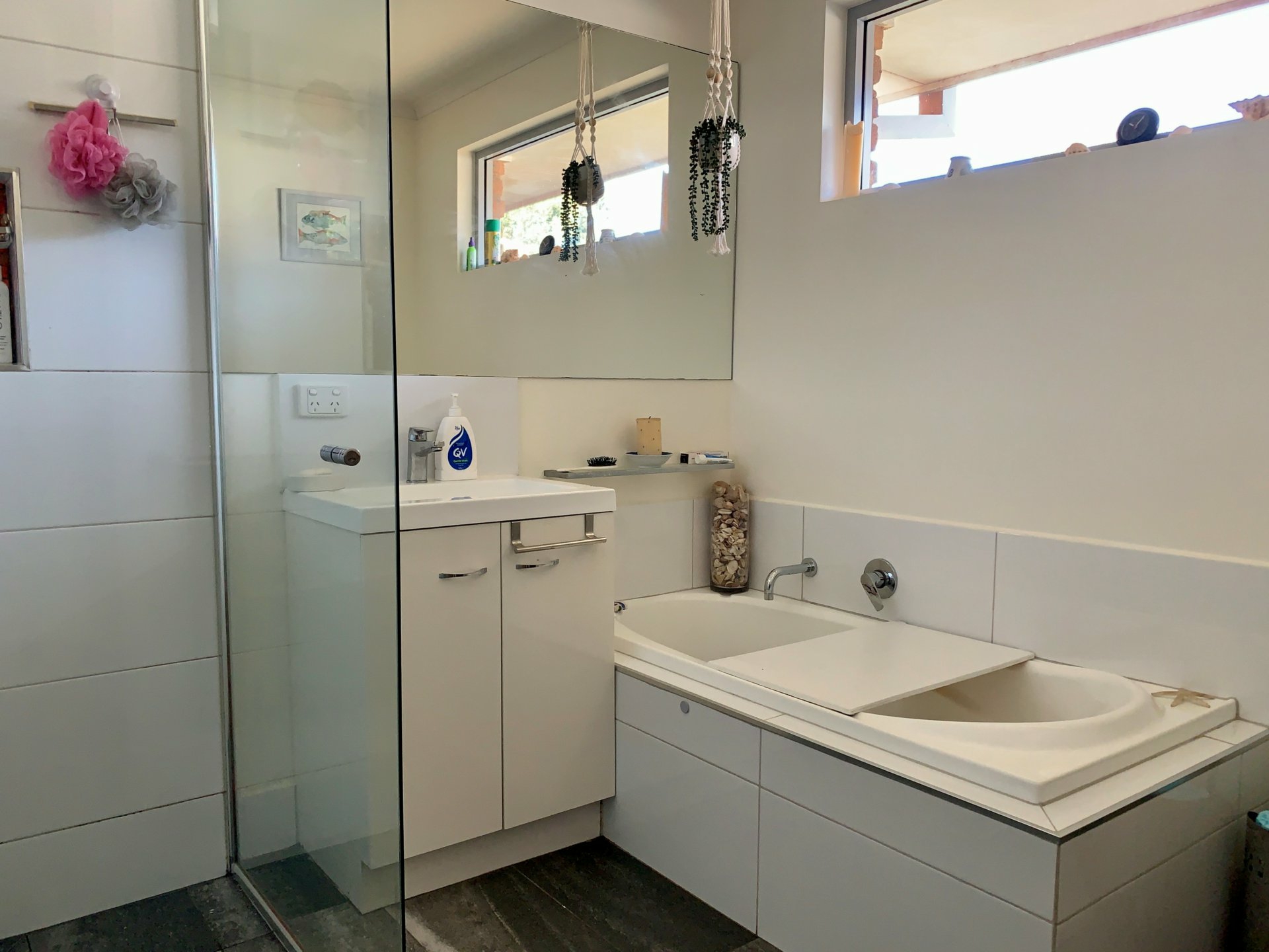 Heating and cooling is provided by a split system with a heat bank in the living room and solar panels to provide reduced electricity bills.