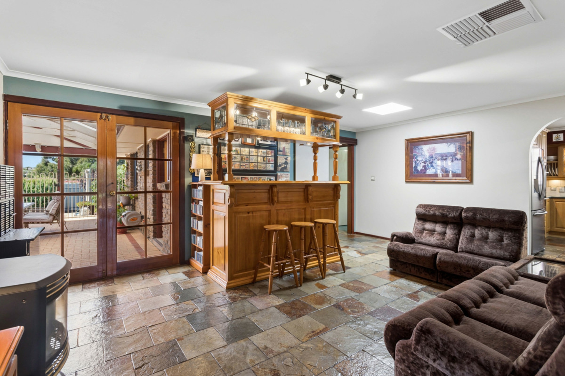 • Central family room with sky-light and French doors connecting indoor and outdoor living