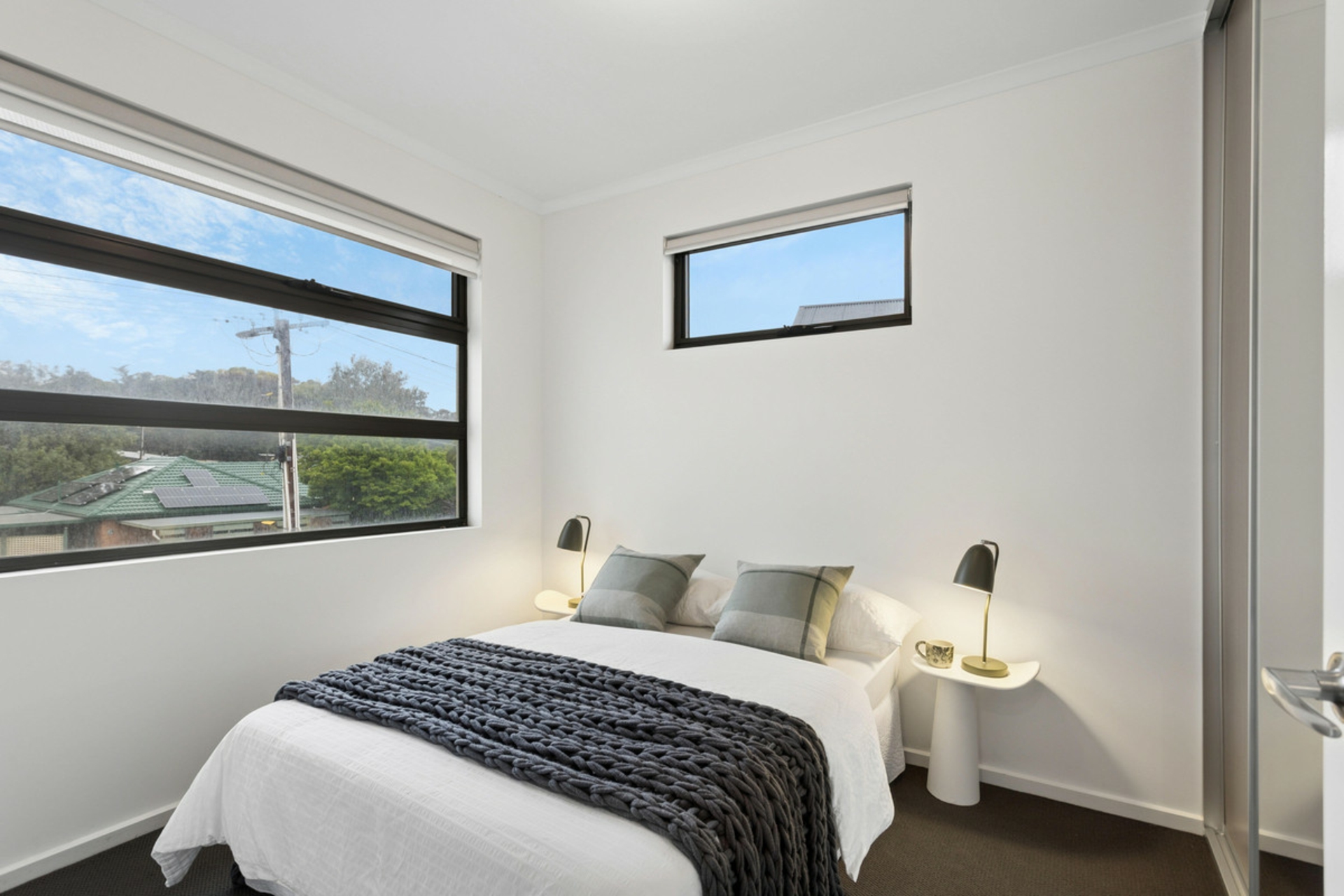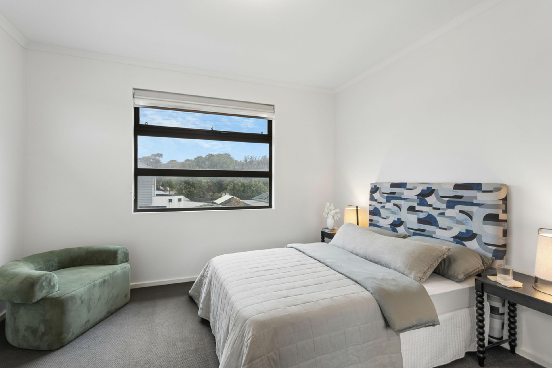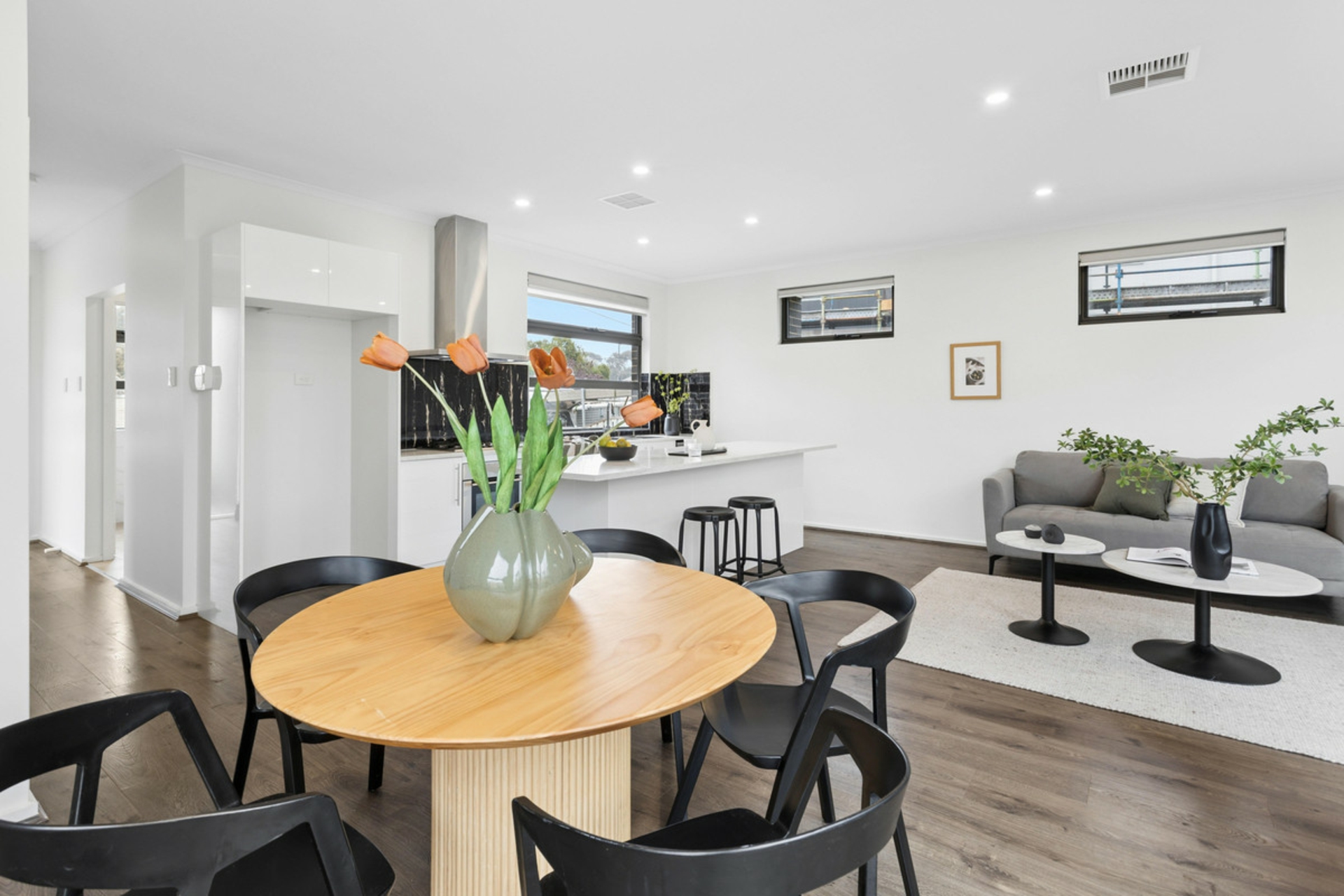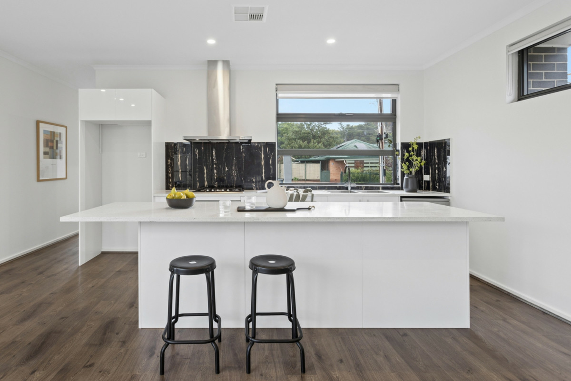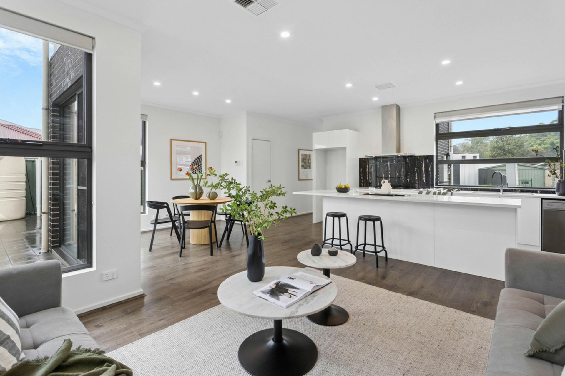 An open-plan layout downstairs centred around a sleek Caesarstone island kitchen, while upstairs provides a private retreat with all bedrooms thoughtfully positioned away from the main living zones, including a spacious master with ensuite.