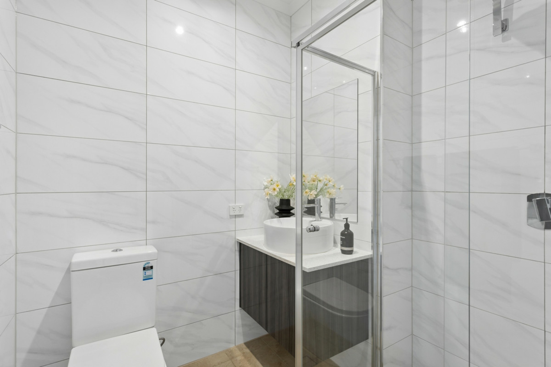 •Vanity downstairs with floor to ceiling tiles, and separate toilet