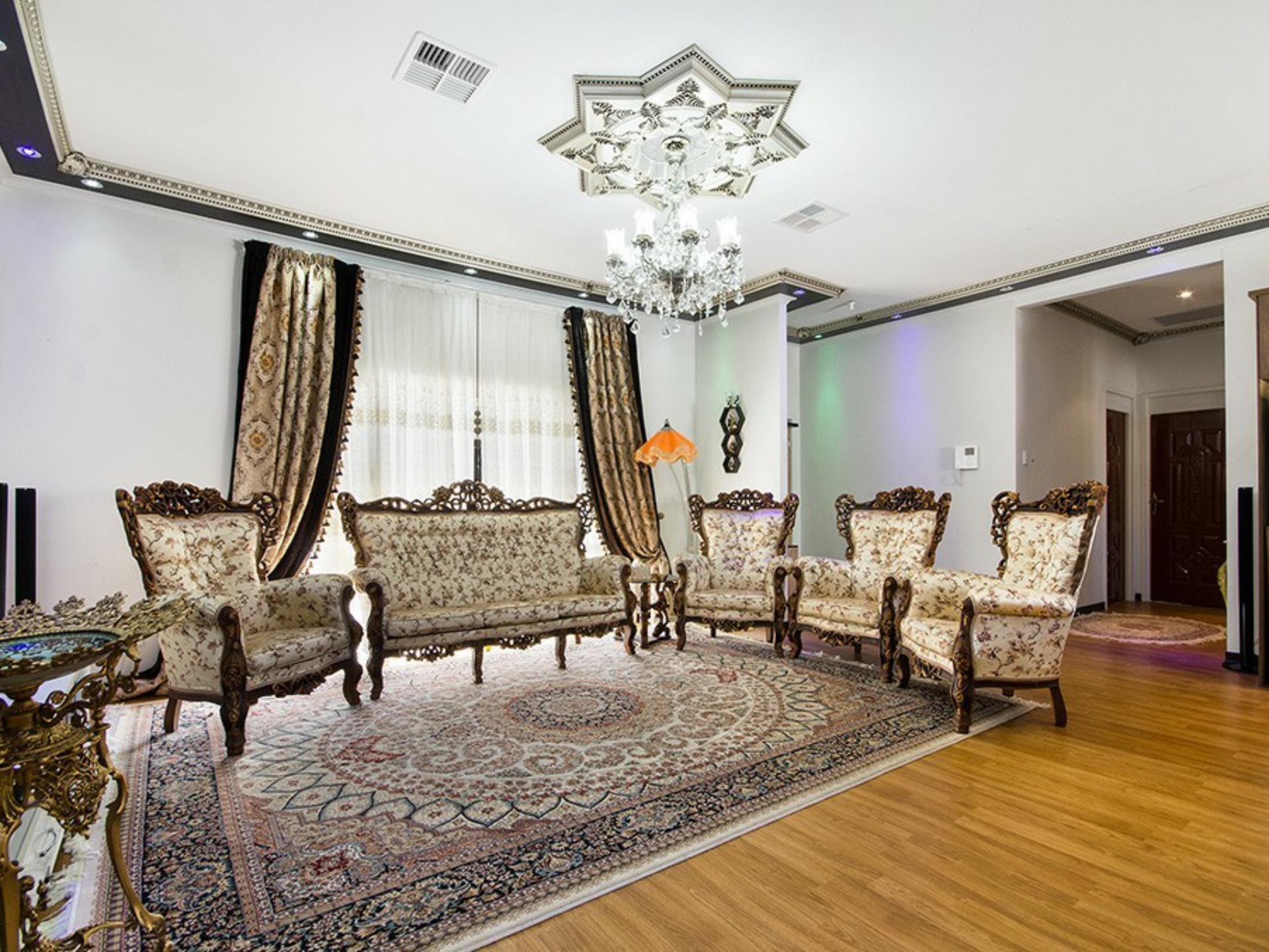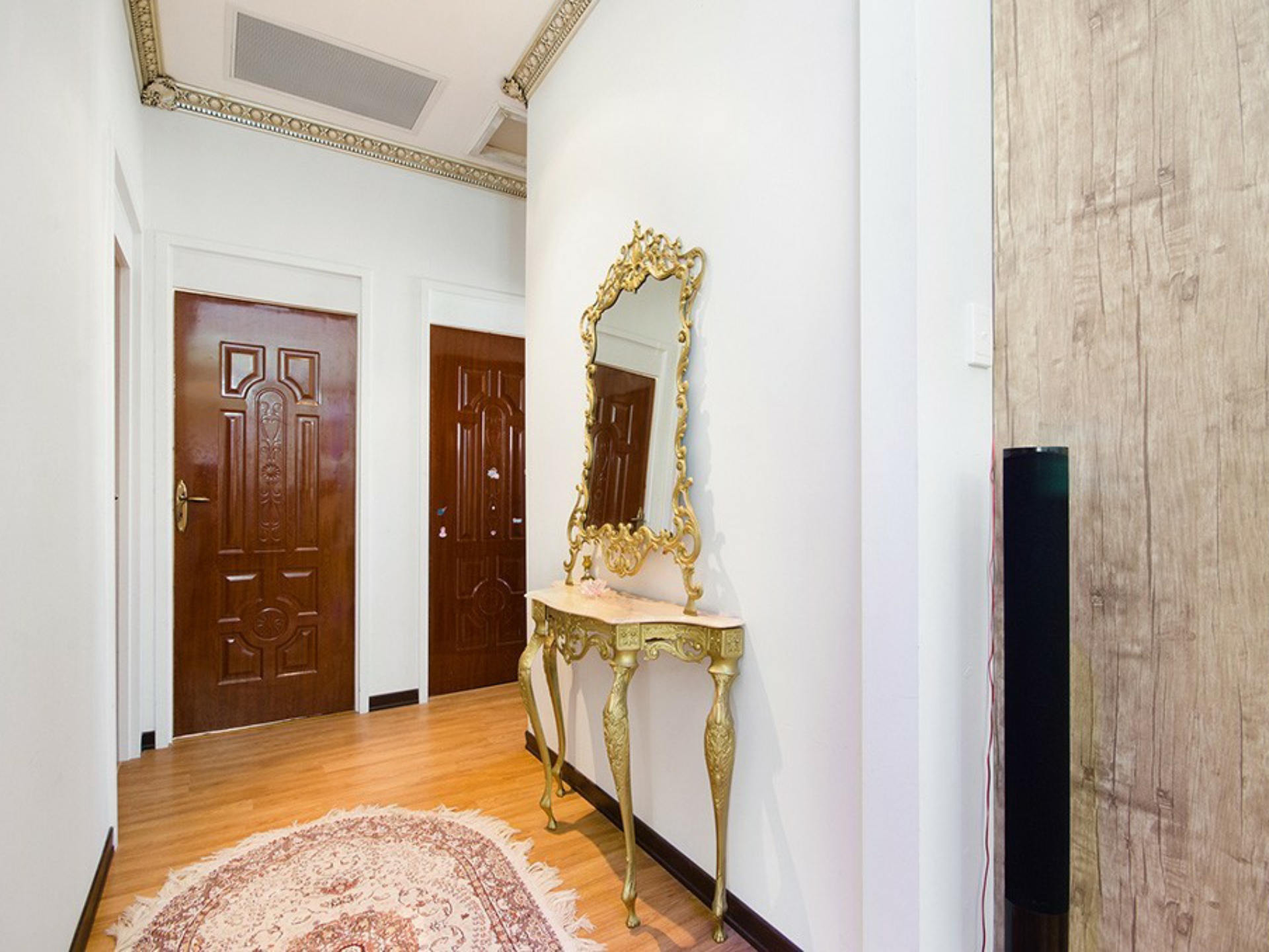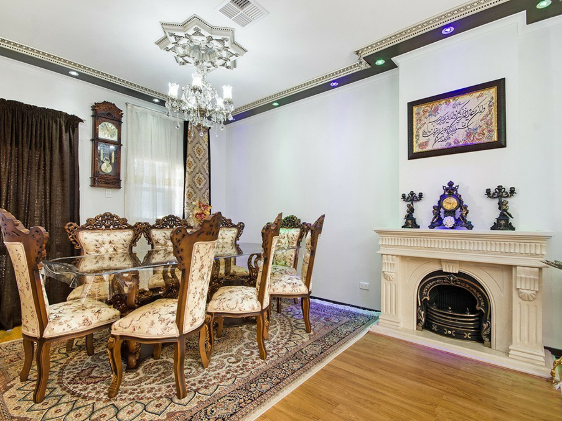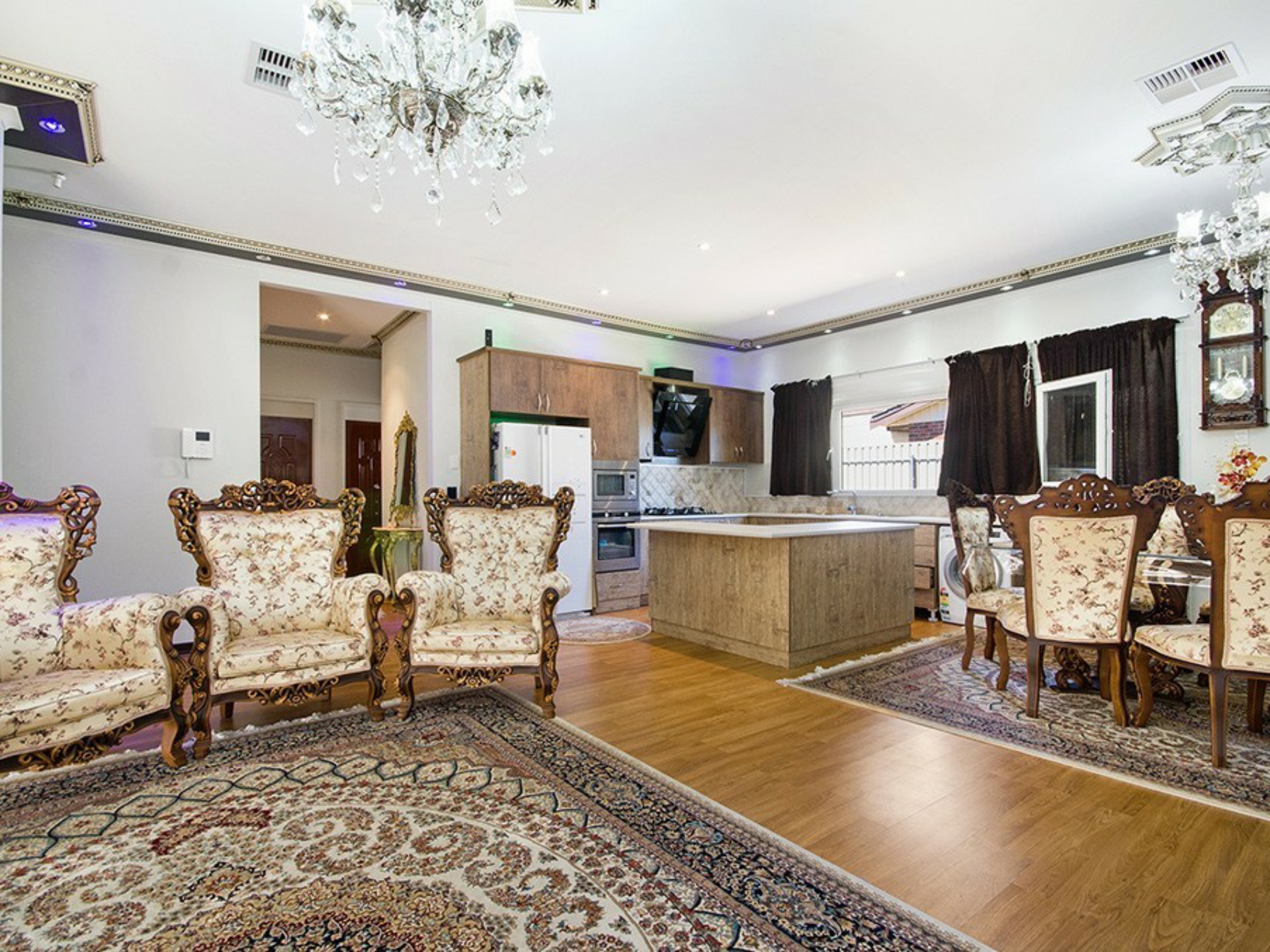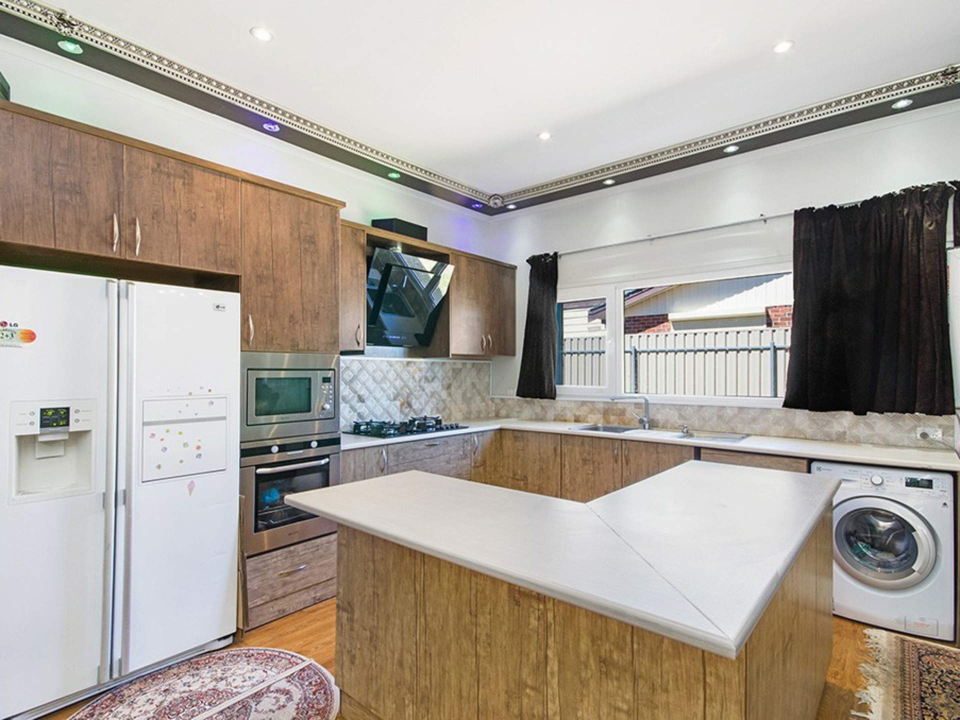 Decorated to the highest standards with most impressive 3m high ceilings with bulk-heads with built in downlights and decorative cornices plus intricate central rosettes. Modern open plan living with fully renovated kitchen including extensive work benches, gas bench-top hot plates, under bench oven and built in microwave, large fridge cavity, touch screen exhaust fan and natural stone splash back.