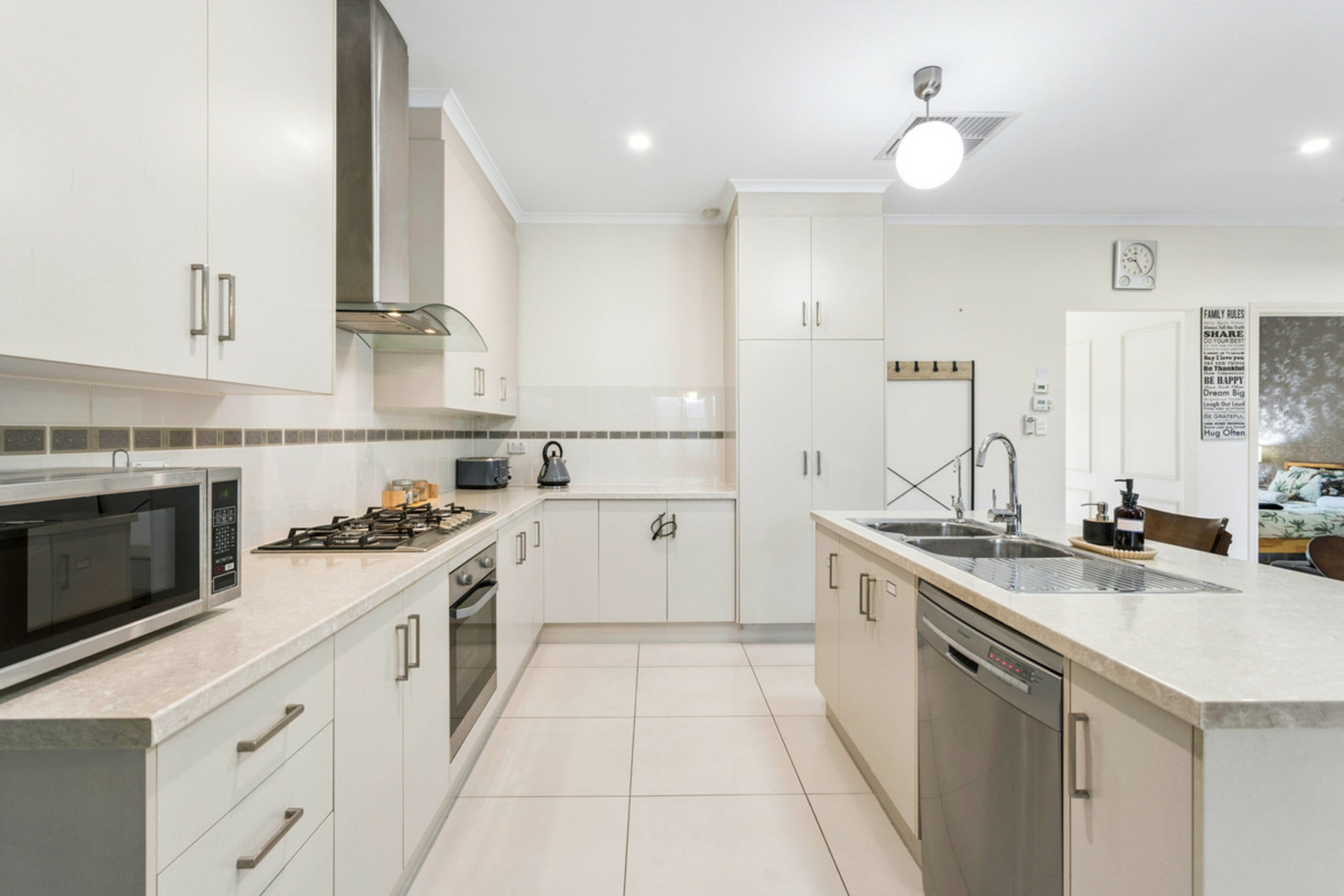 • Central kitchen with breakfast bar, ample storage and bench space, gas cooktop, electric oven and dishwasher