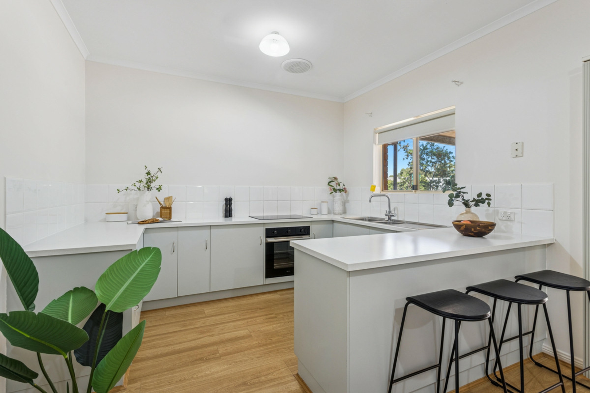 • Central kitchen with ample bench space and storage, breakfast bar, electric cooktop & oven
