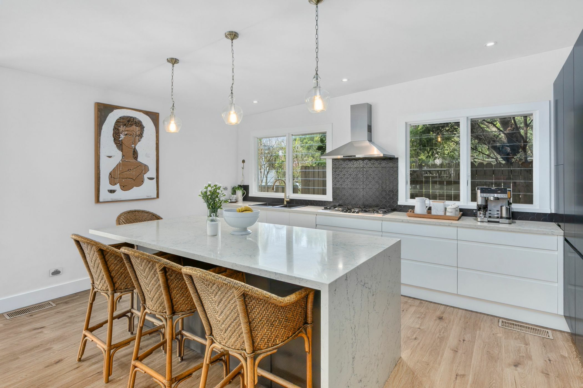 • Stunning open-plan chef's kitchen with Caesarstone benches, custom soft-close cabinetry, integrated Bosch appliances including double oven, gas stove, and eat-in island bench