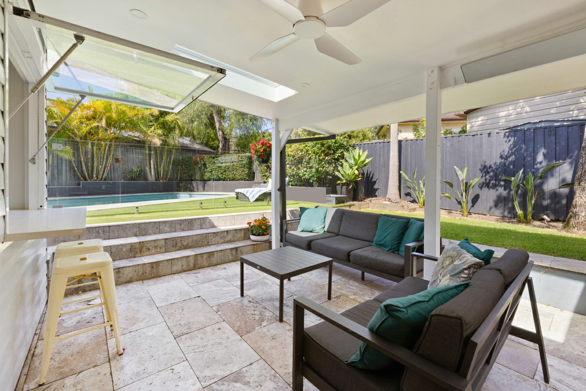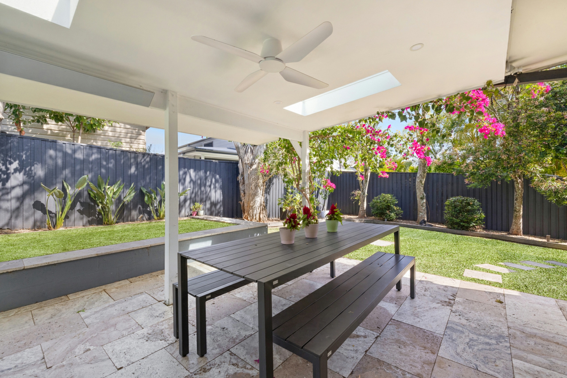 • Spend long summer afternoons relaxing or entertaining on the travertine alfresco space framed by bright bougainvillea