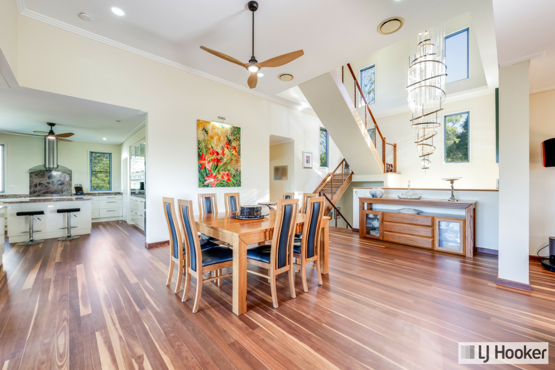 Dining transitions effortlessly onto expansive elevated decking that extends the living experience outdoors in two distinct directions:
