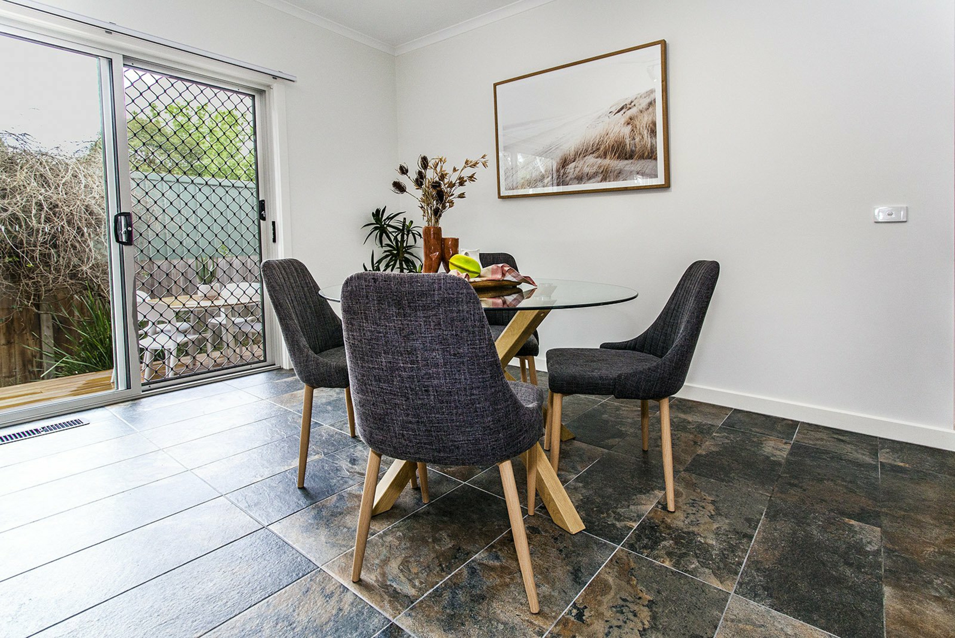 Inside, Vic ash floorboards run throughout, giving the home a warm and cohesive feel. The living and dining zone is cosy and welcoming, ideal for relaxed evenings, while ducted heating and evaporative cooling provide year-round comfort. The kitchen sits at the heart of the home, positioned for effortless daily living.