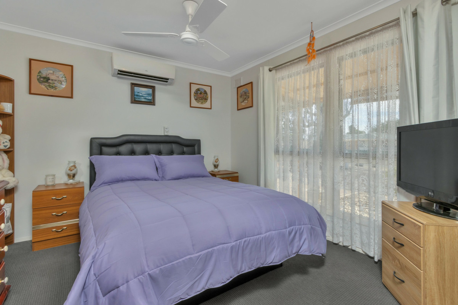 • Master bedroom with ceiling fan and split system air conditioner.