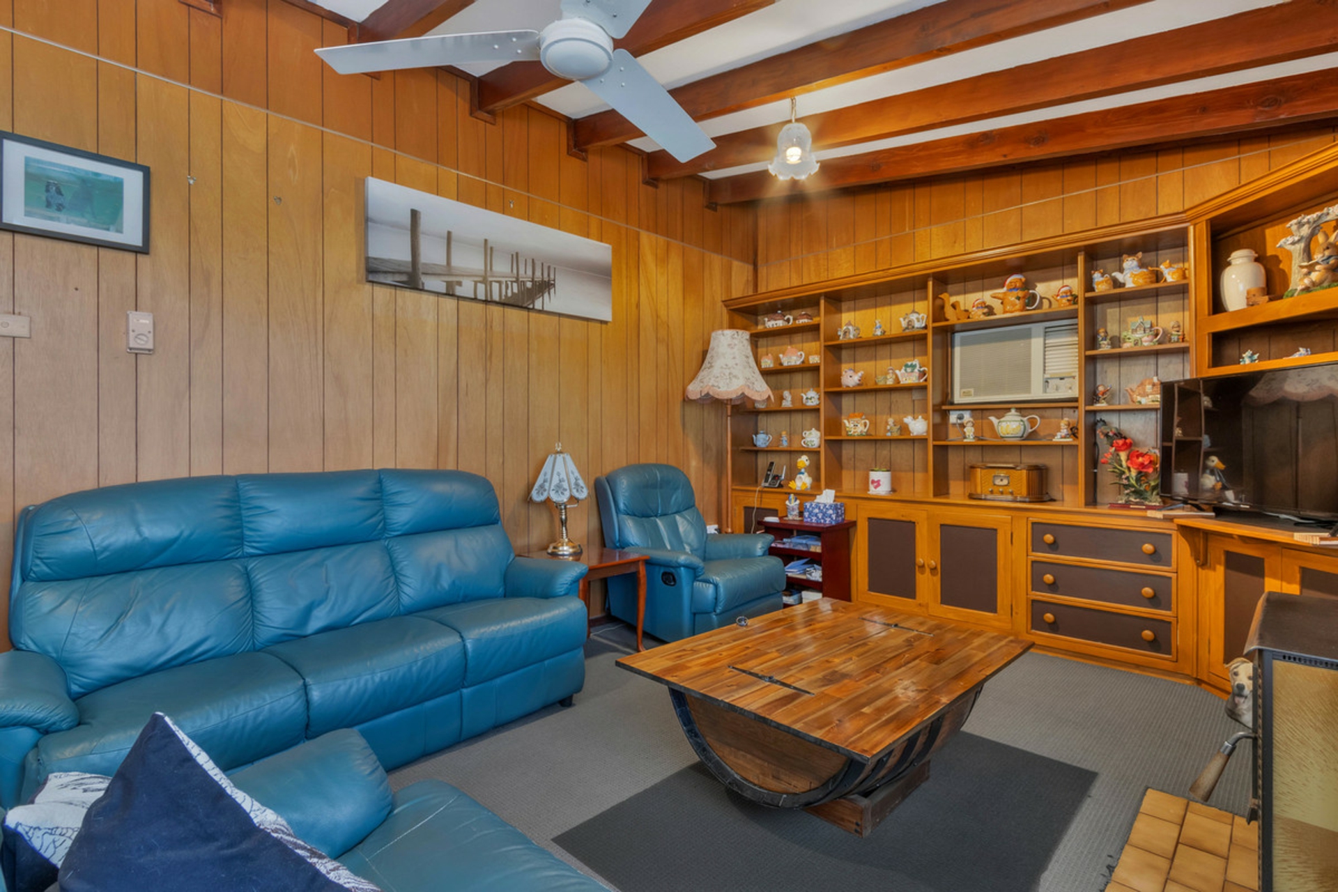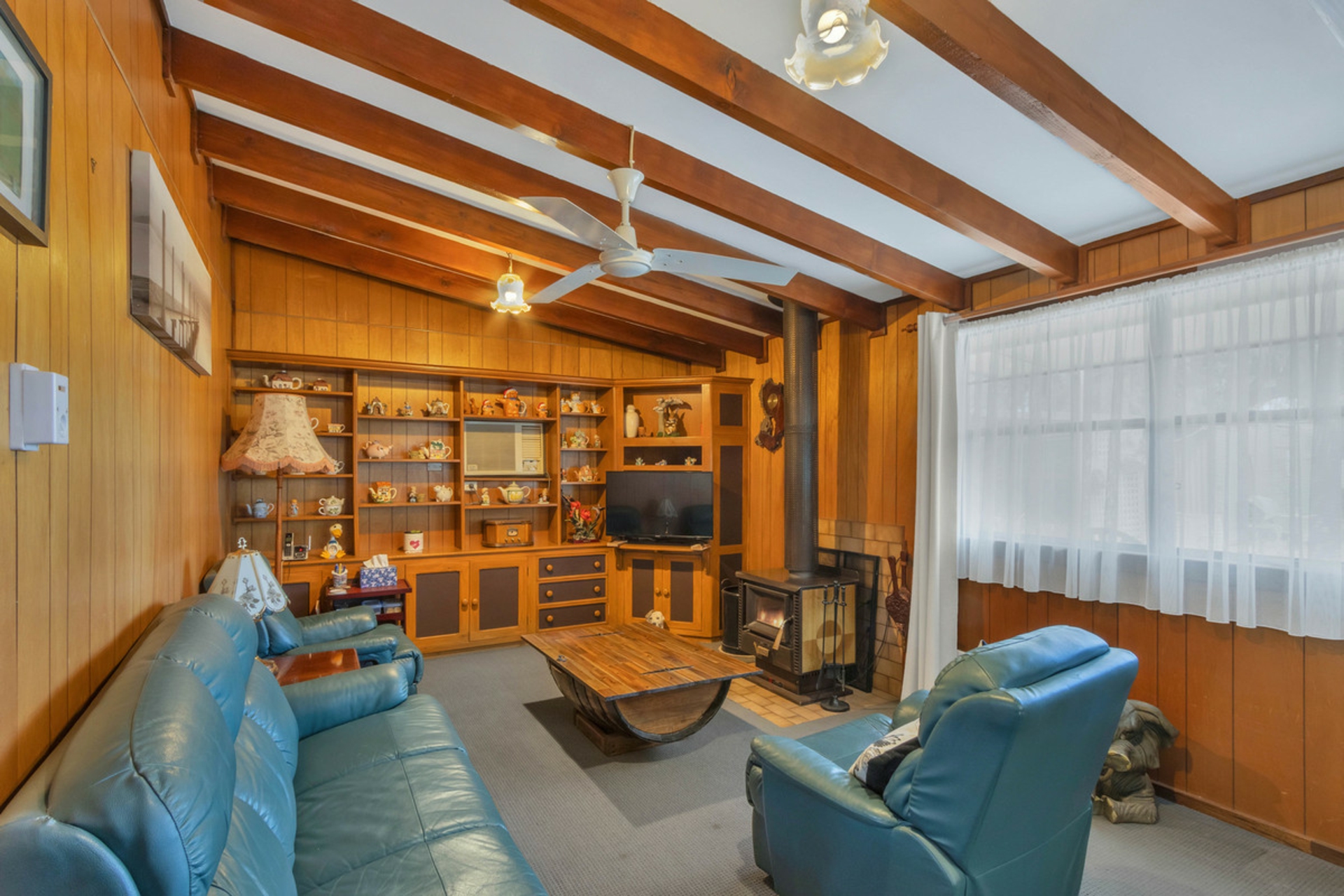 • The second living area has a fireplace and ceiling fan.
