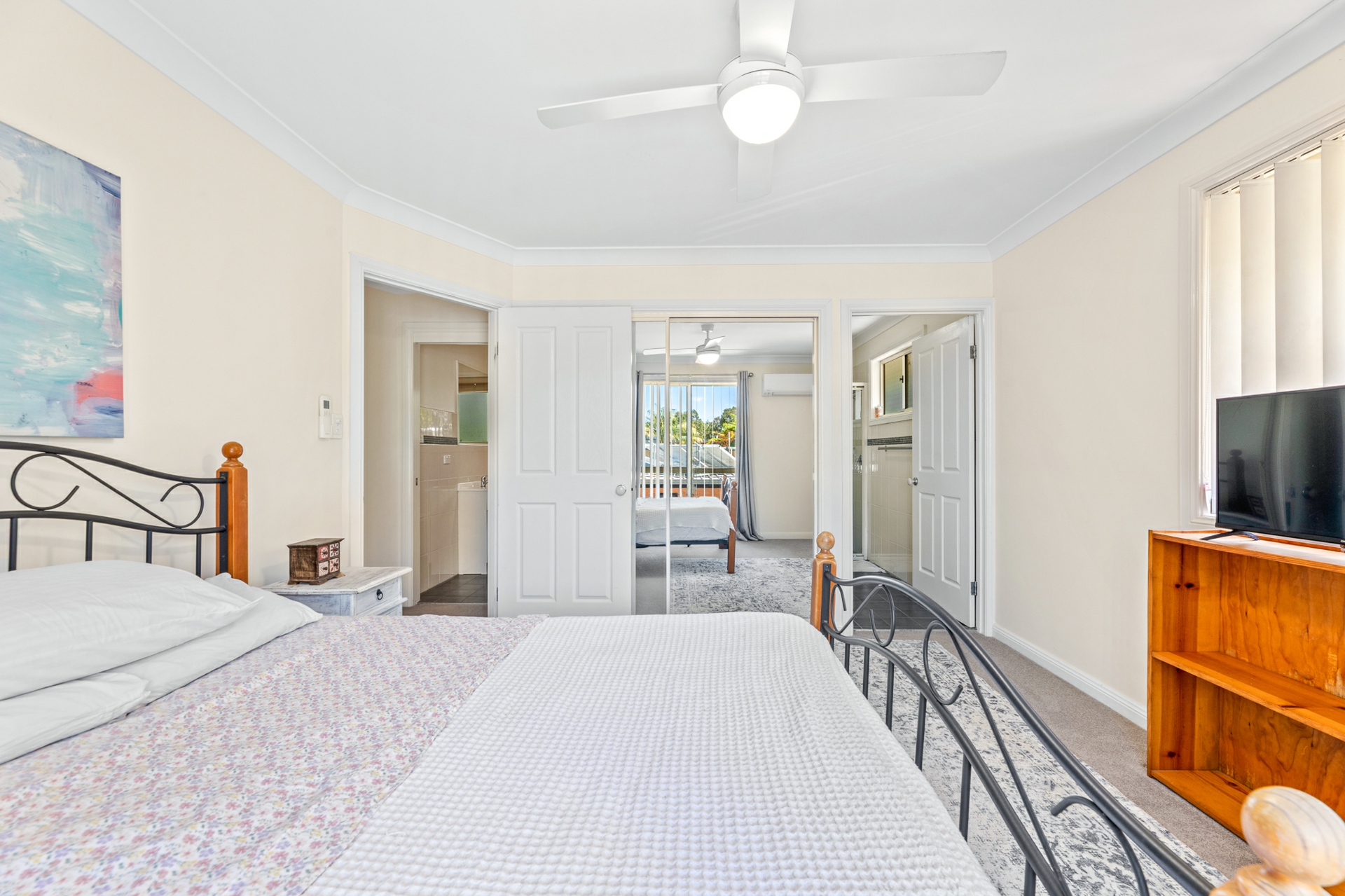 The home features three bedrooms with built-ins, including a generous master with ensuite and built-in robes. Comfort is assured year-round with air conditioning and ceiling fans.