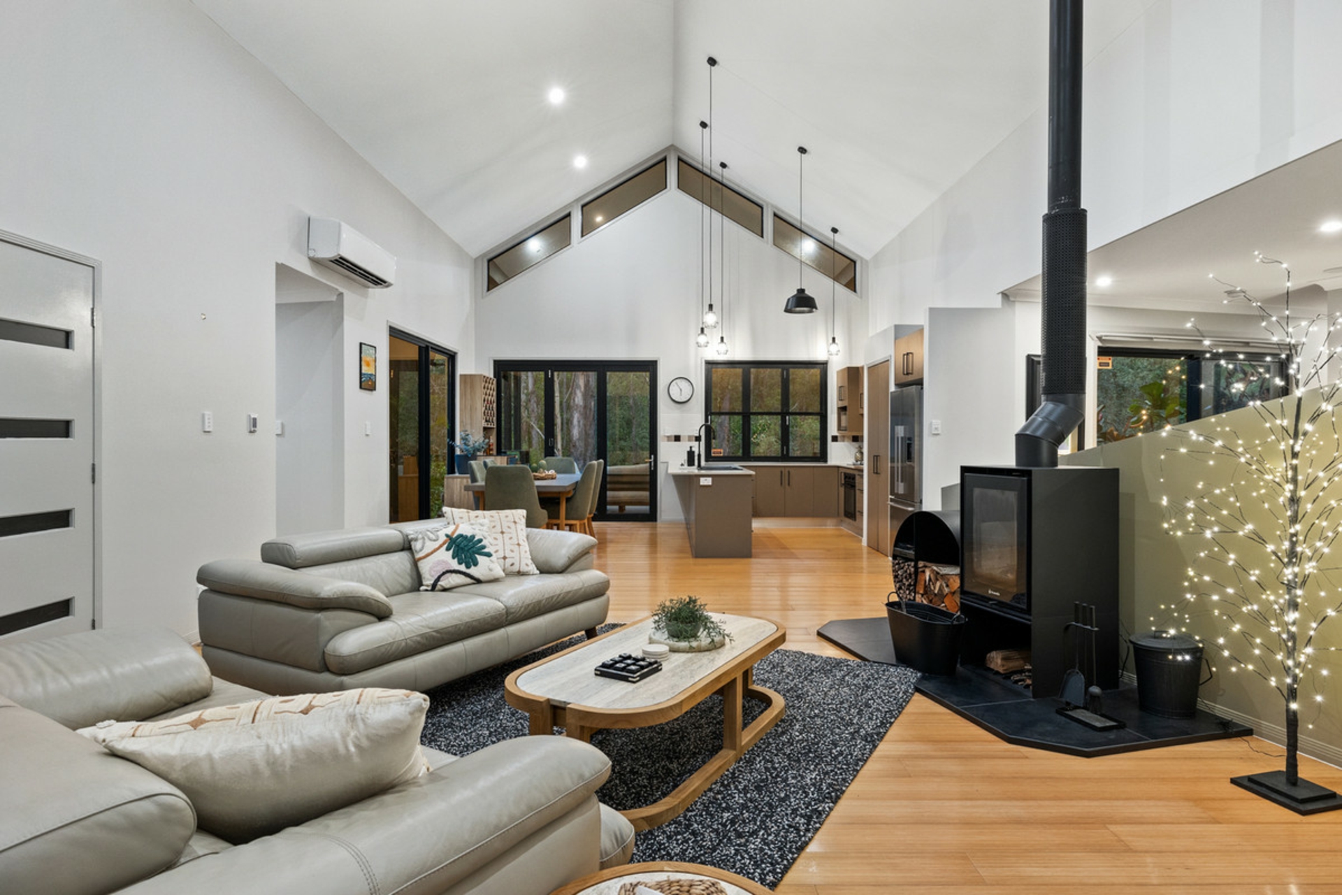 •Open/living dining area featuring Scandia wood heater; access to both front and back yards