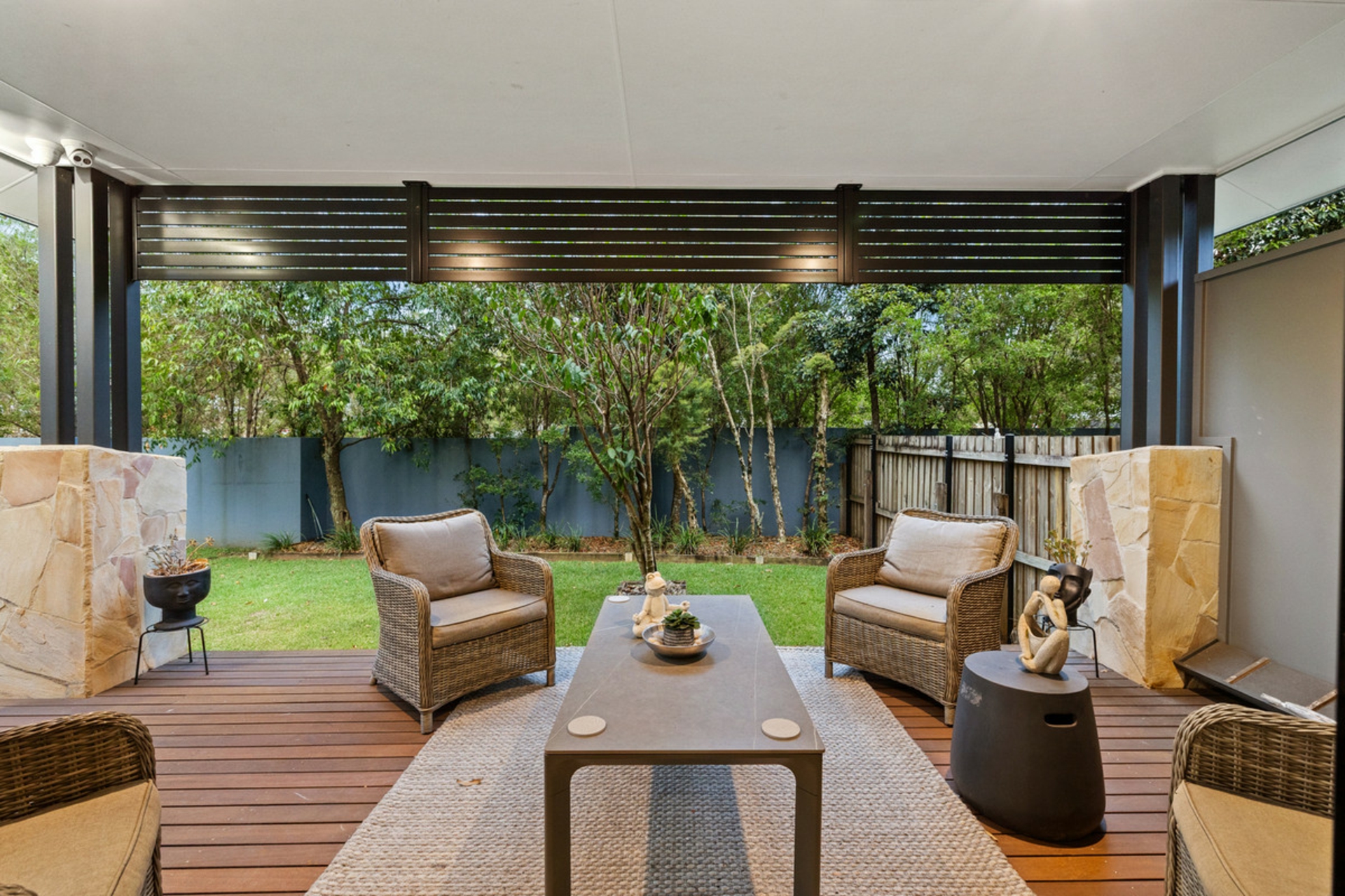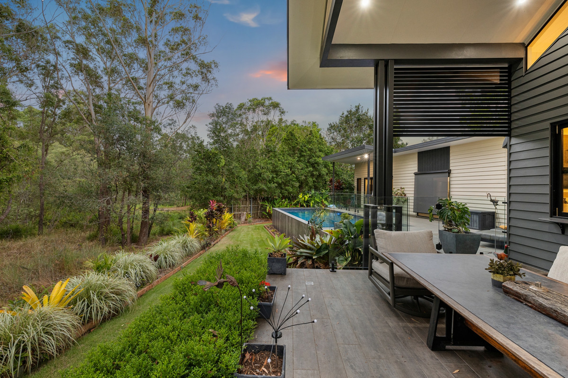 •Covered entertainment deck set in bushland backdrop featuring Aquafresh inground pool with heat pump; surround sound speakers