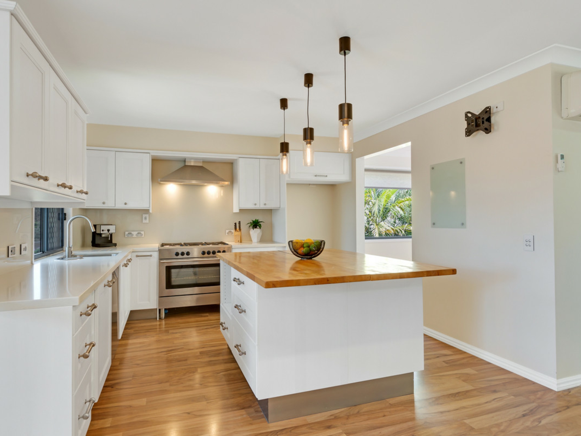 •Hostess kitchen featuring large island bench; stone/timber countertops; plenty of cupboard space; soft close drawers; 900mm freestanding gas stove; stop tap for plumbed fridge