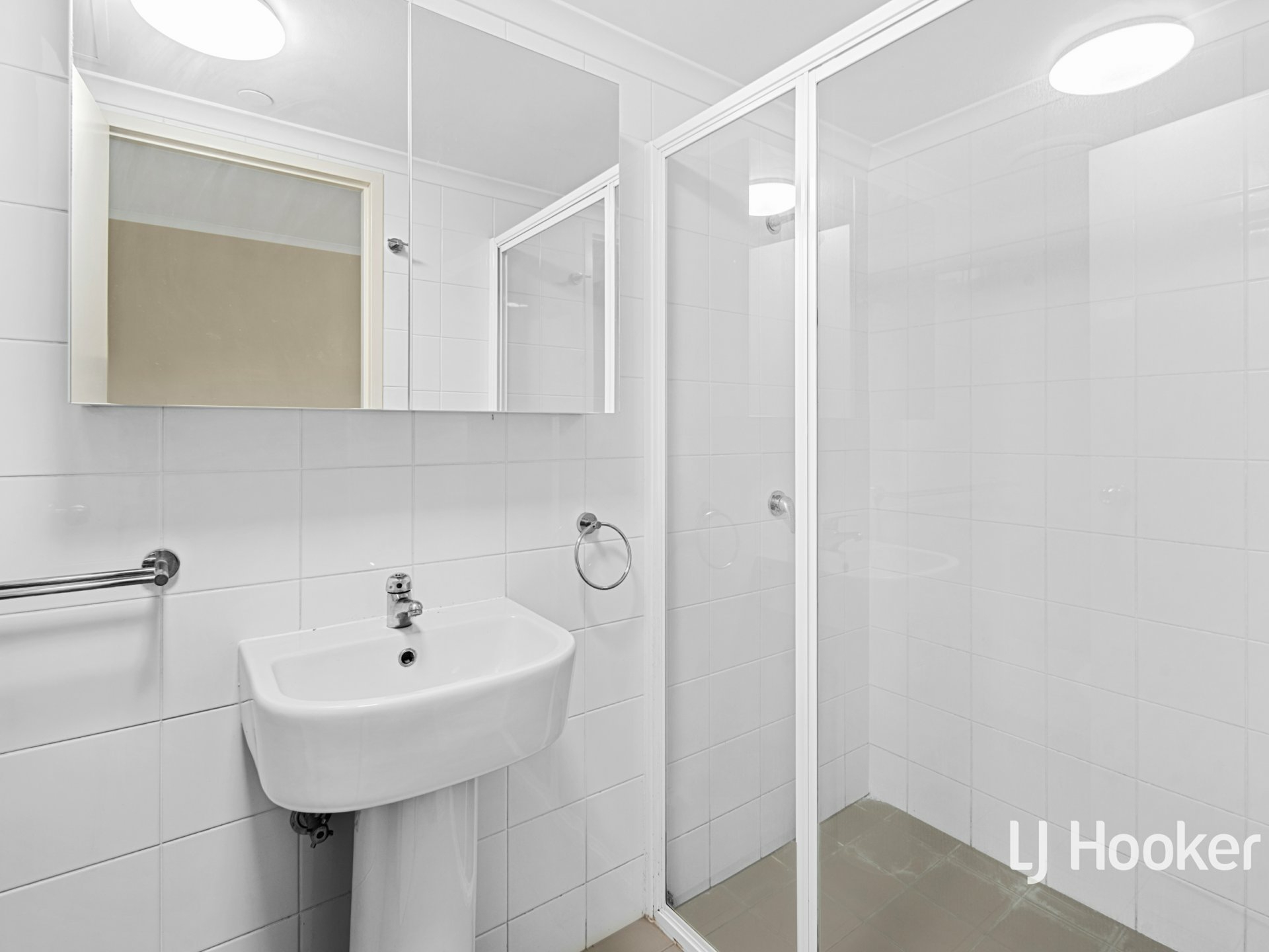 The modern bathroom features a generous shower, vanity, and toilet, all presented in excellent condition. A split-system air conditioner ensures year-round comfort.