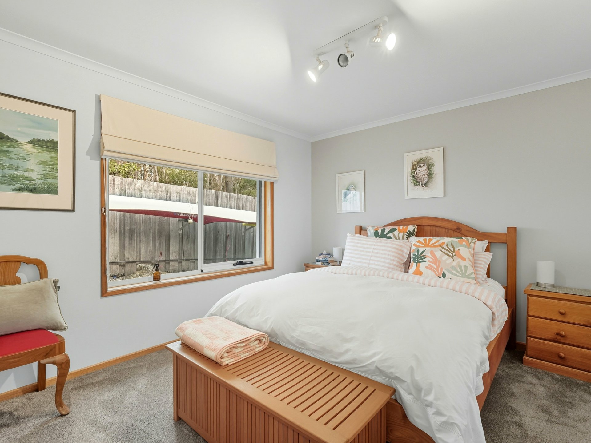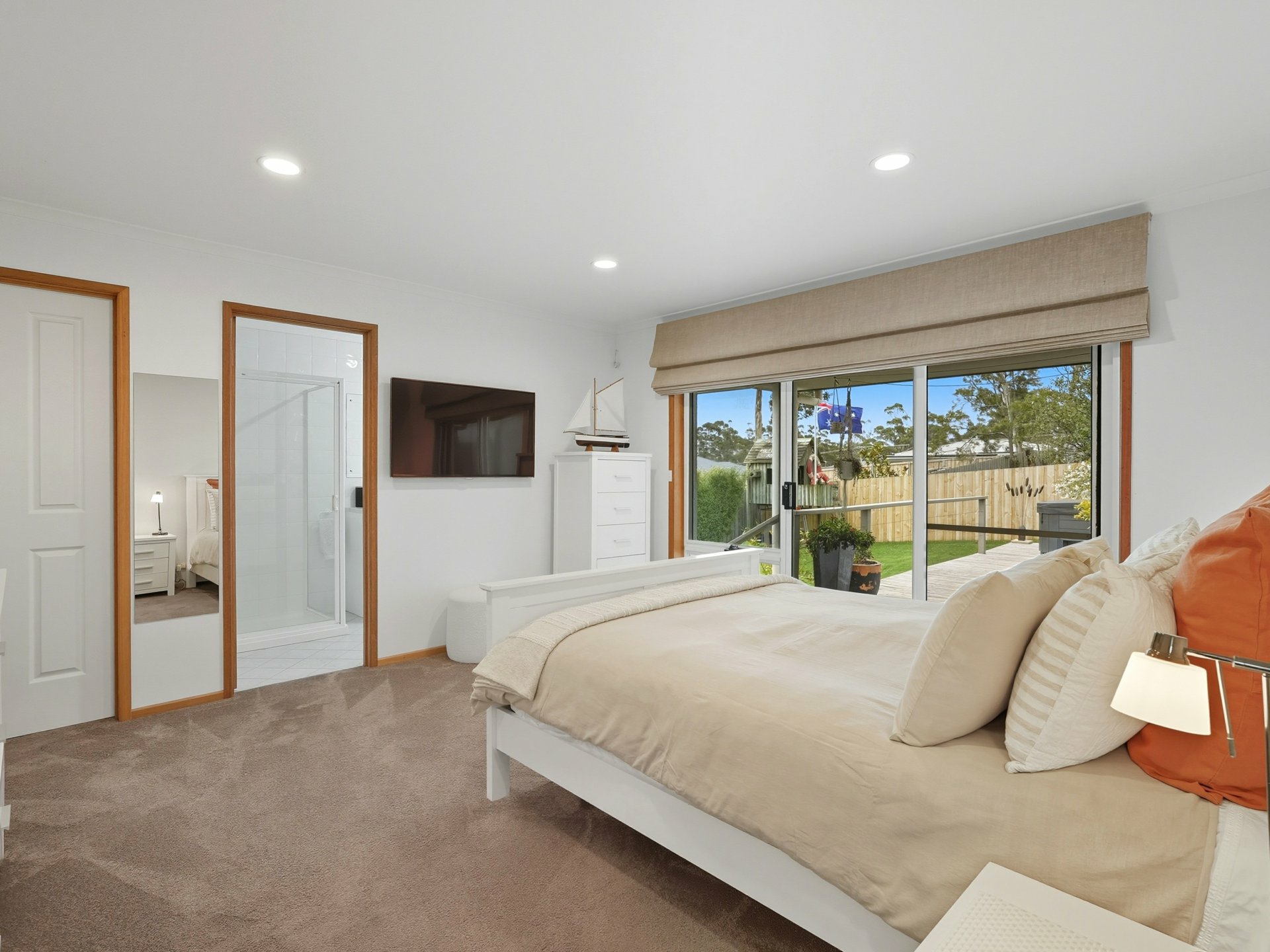 A private space with updated walk-in robe (new soft-close drawers 2024), freshly refurbished ensuite and a premium French-linen electric roman blind adding a touch of luxury.