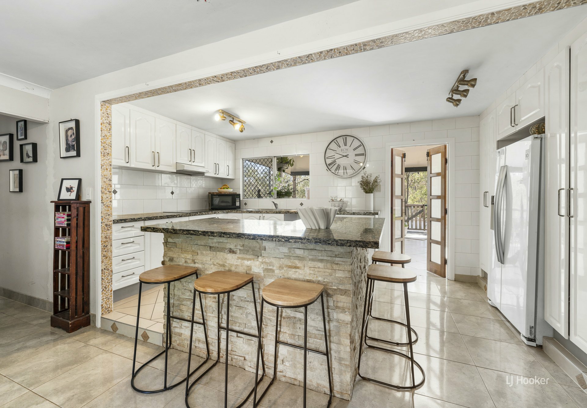 Renovated kitchen with island bench, pantry, electric oven, hotplates and rangehood