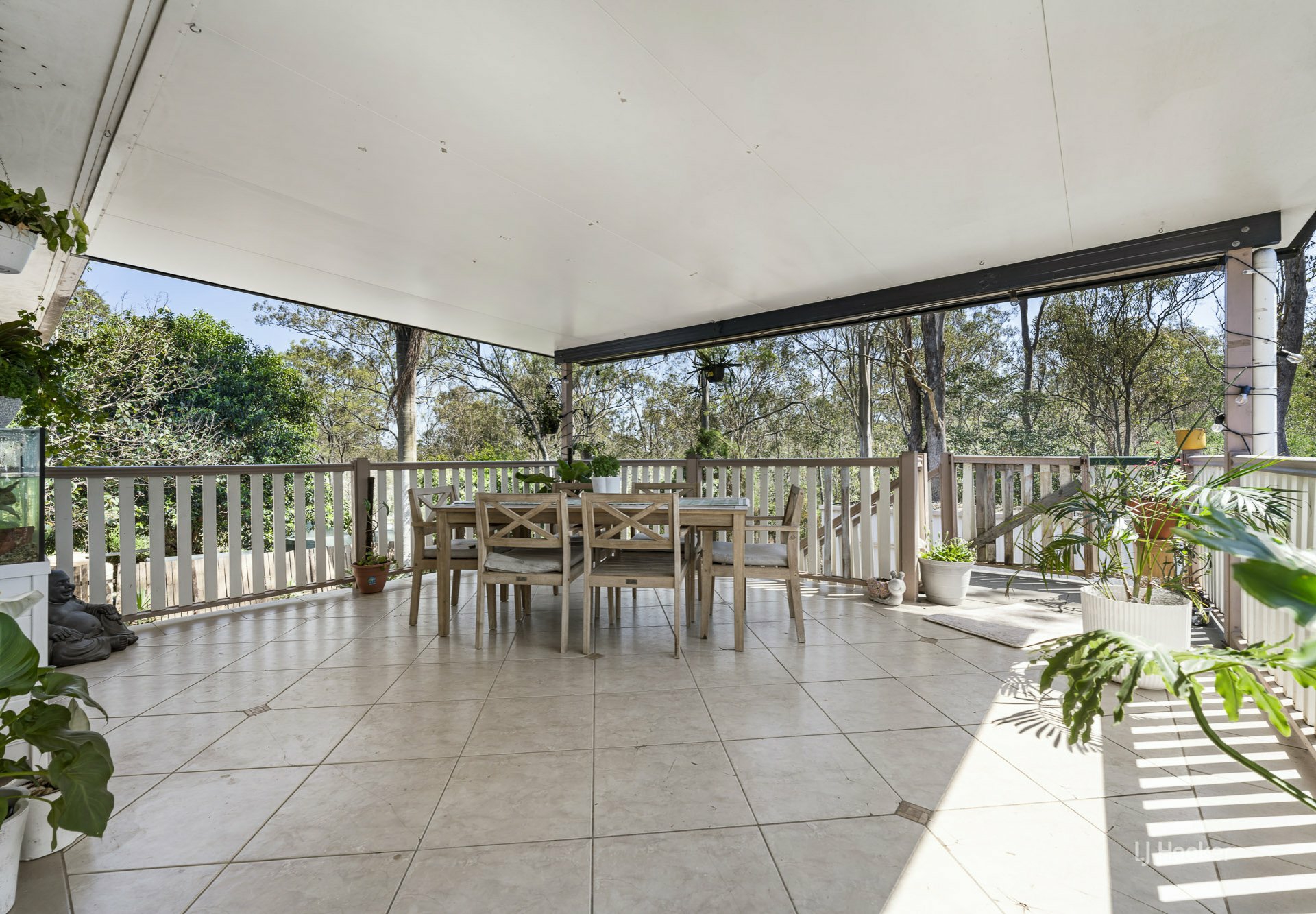 Large deck upstairs with insulated roof overlooking bushland