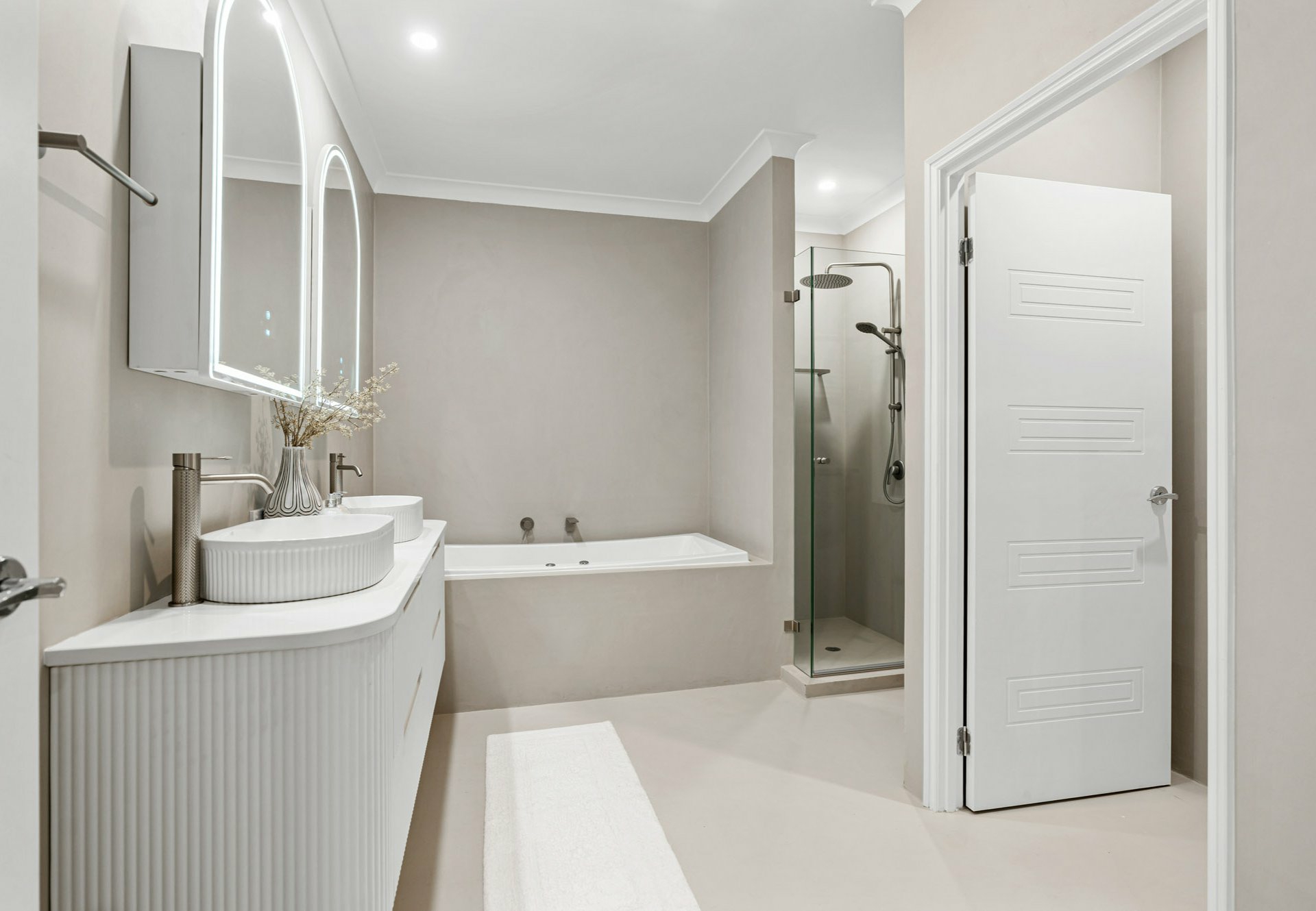 Ensuite includes separate toilet, bath, shower + his & hers vanity with LED mirror cabinets