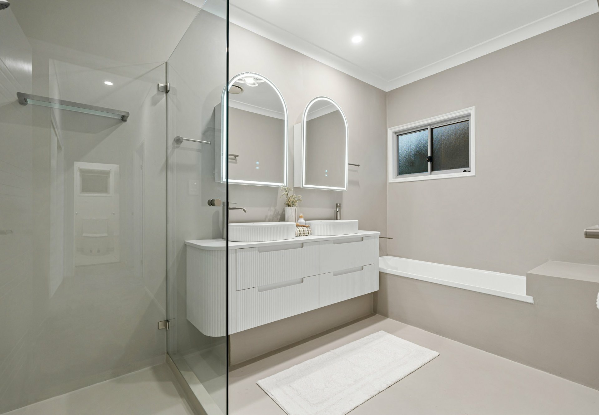Main bathroom with shower, bath + double basin & LED mirror cabinets