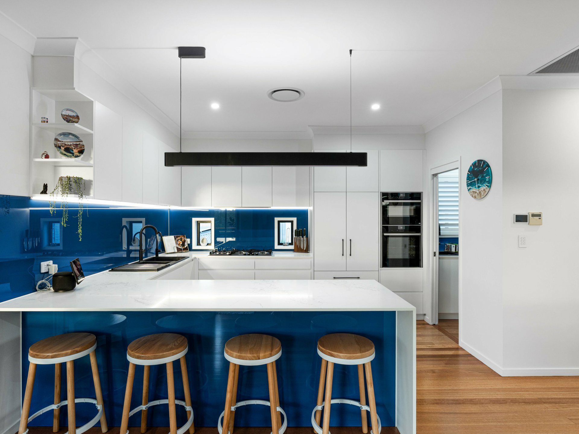 Flawless kitchen with custom cabinetry, integrated dishwasher and French door fridge (with plumbed ice maker), Zip Hydrotap features cold, boiling and sparkling water, Neff appliances including Oven with steam function, 900mm wide gas cook-top, Compact oven with microwave, butlers pantry, Caesar stone benchtops, all overlooking the living area allowing the chef to be part of the entertainment