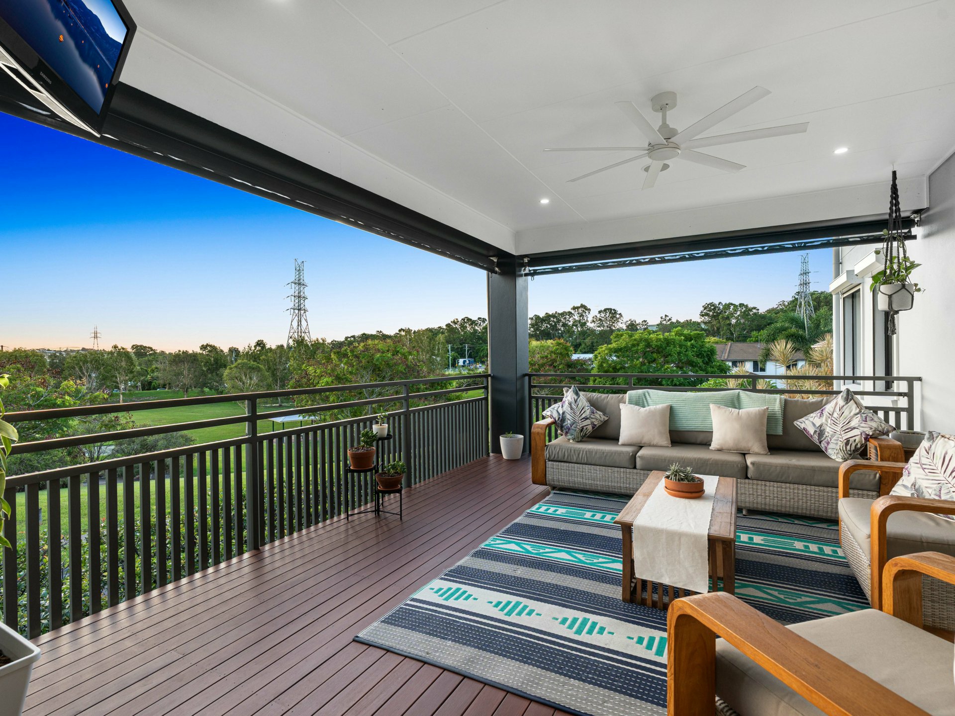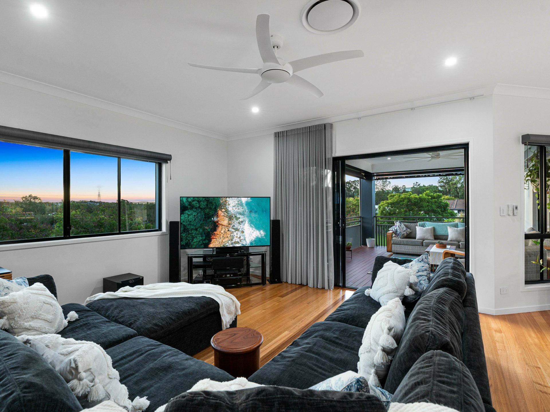 Large open-plan living & dining seamlessly extending to the covered entertainer's deck overlooking the park and city – outdoor speakers connected, blinds, and heat strip