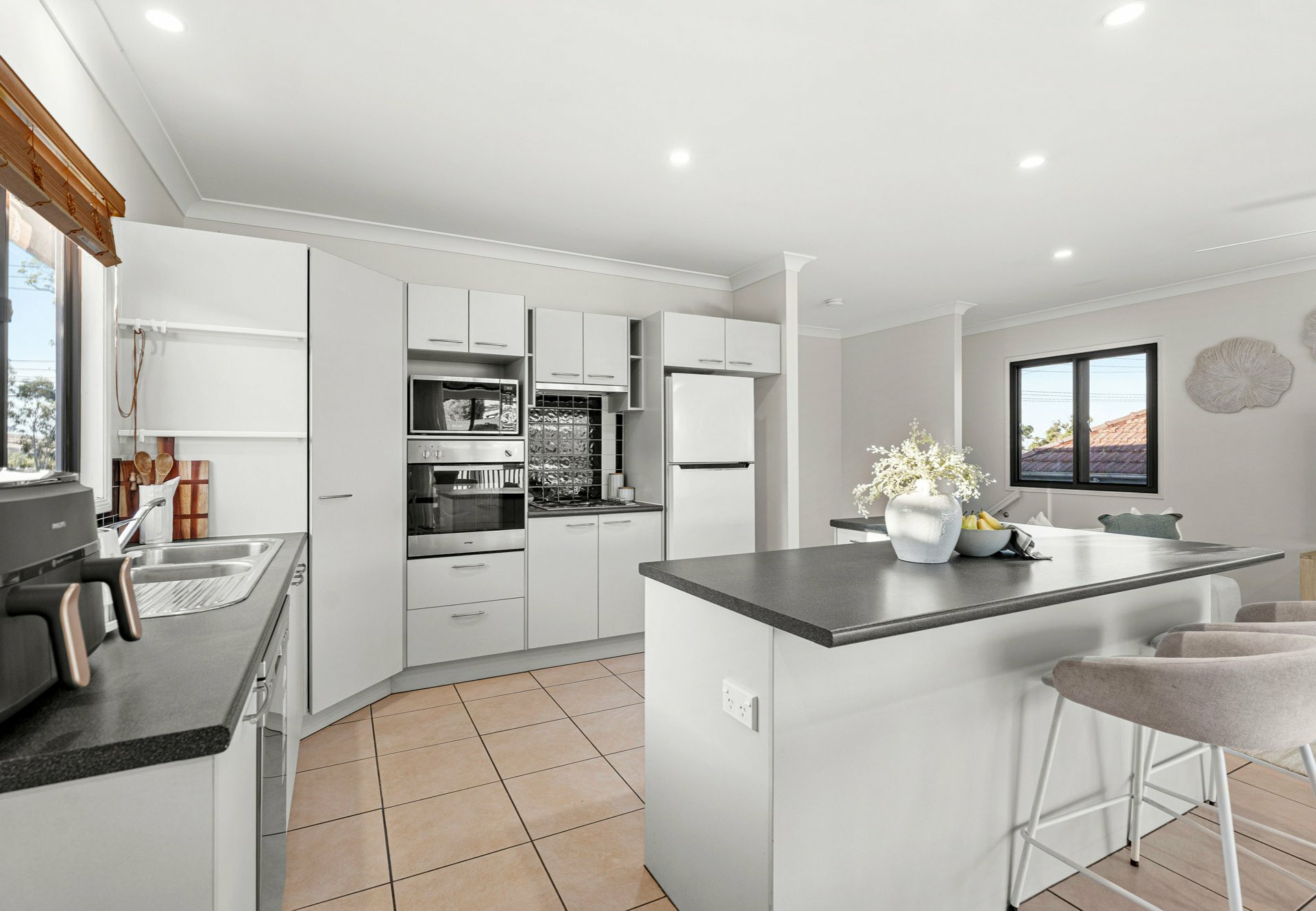 Kitchen with gas cooktop, electric over, dishwasher, breakfast bar + plenty of cupboard space