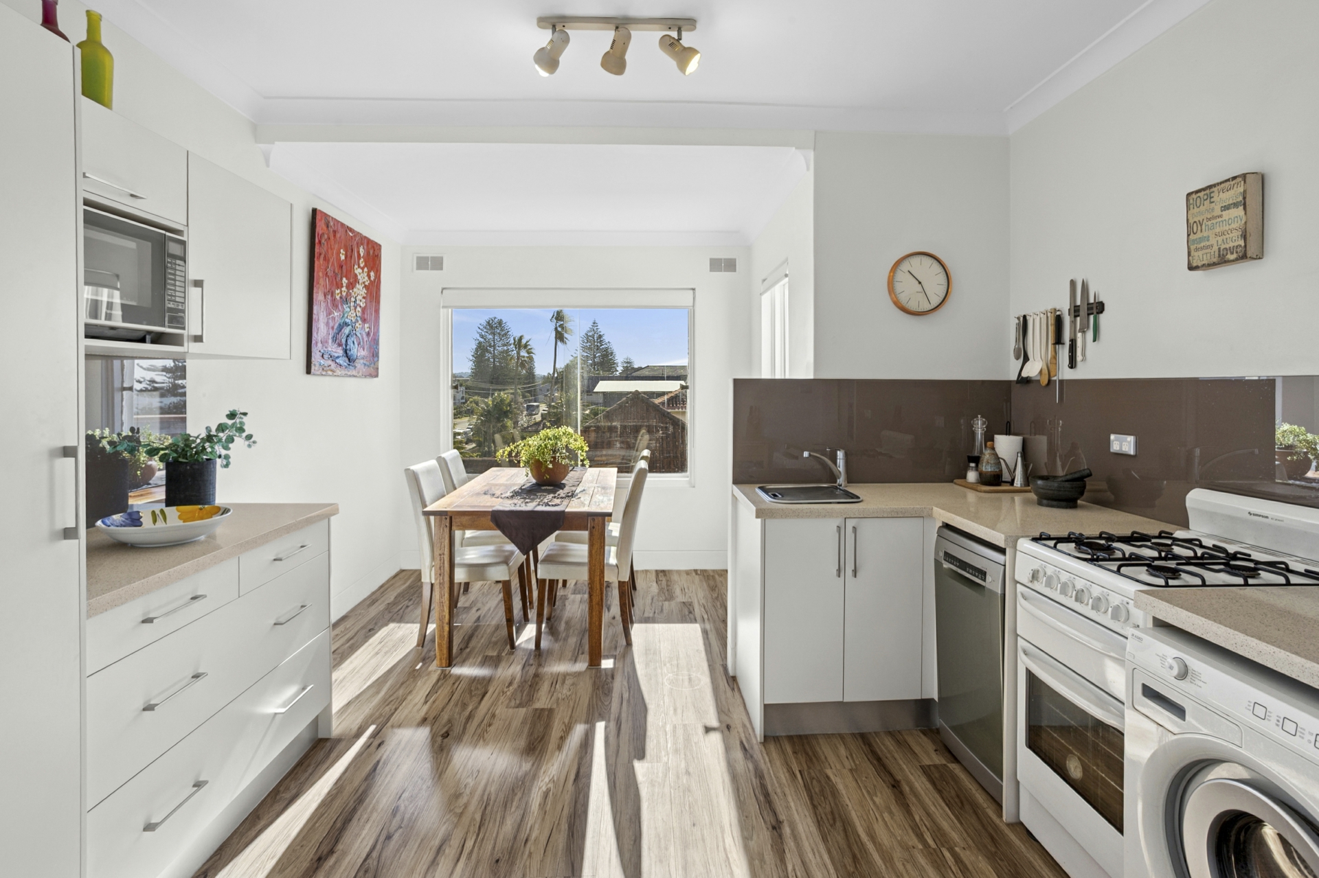 • Eat-in kitchen with stone benches, gas cooking and dishwasher