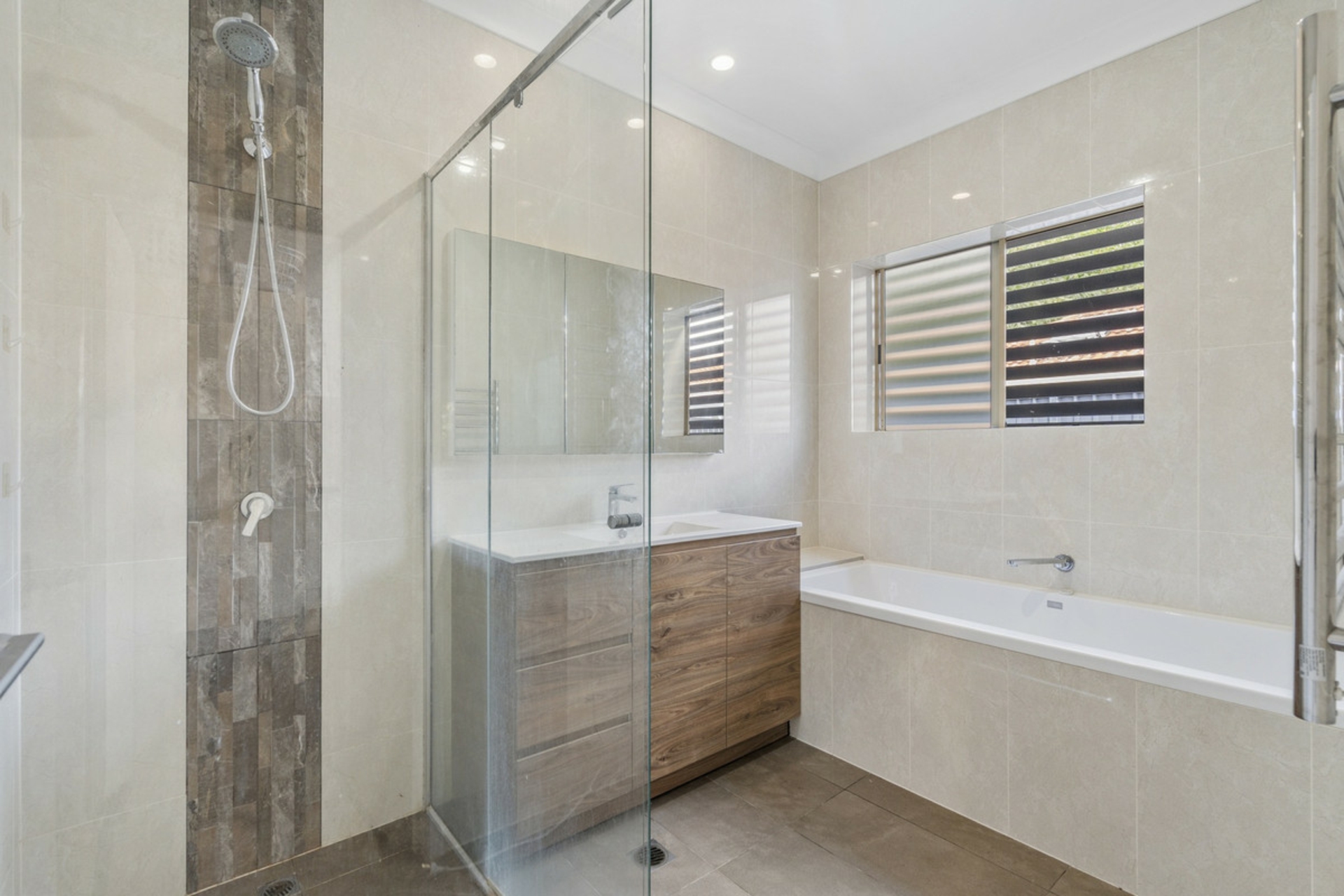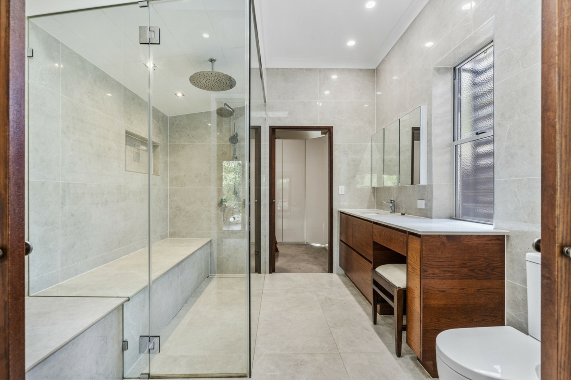 Spacious master bedroom with walk in robe and an impressive ensuite with a fully enclosed steam room / shower, featuring double shower heads, bench seating, shower niche, floor to ceiling tiles and an oversize custom vanity