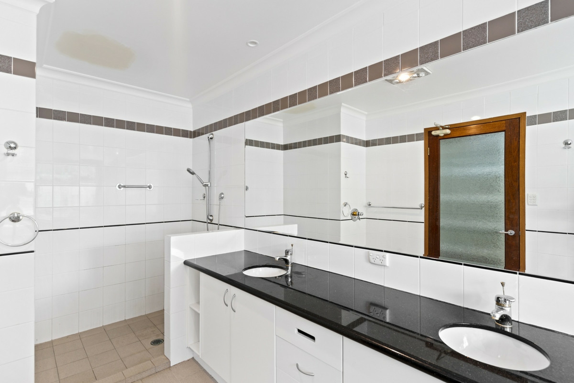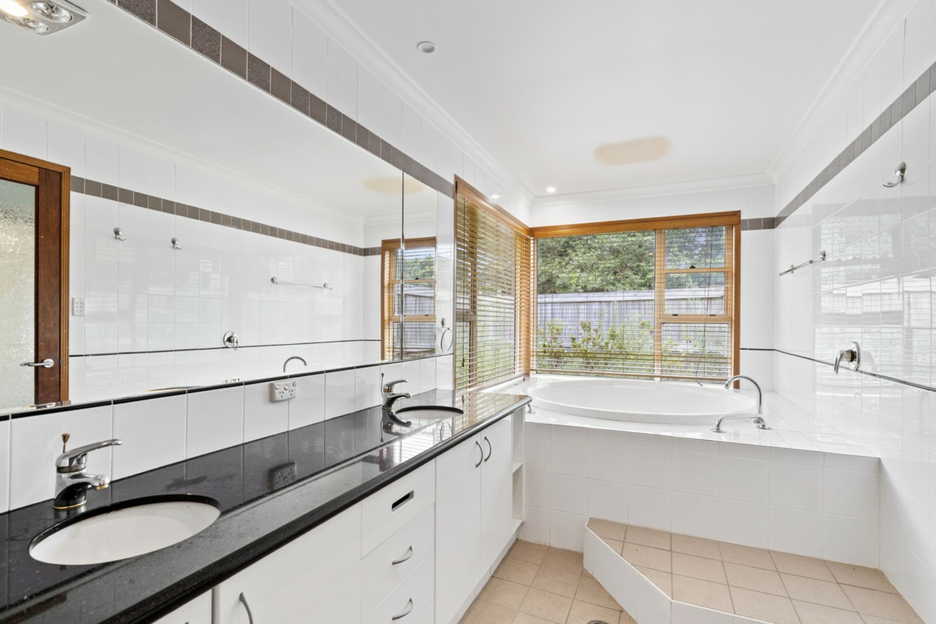 Master bedroom featuring an enormous walk-in robe and an impressive ensuite with shower, bathtub, double vanity and floor to ceiling tiles