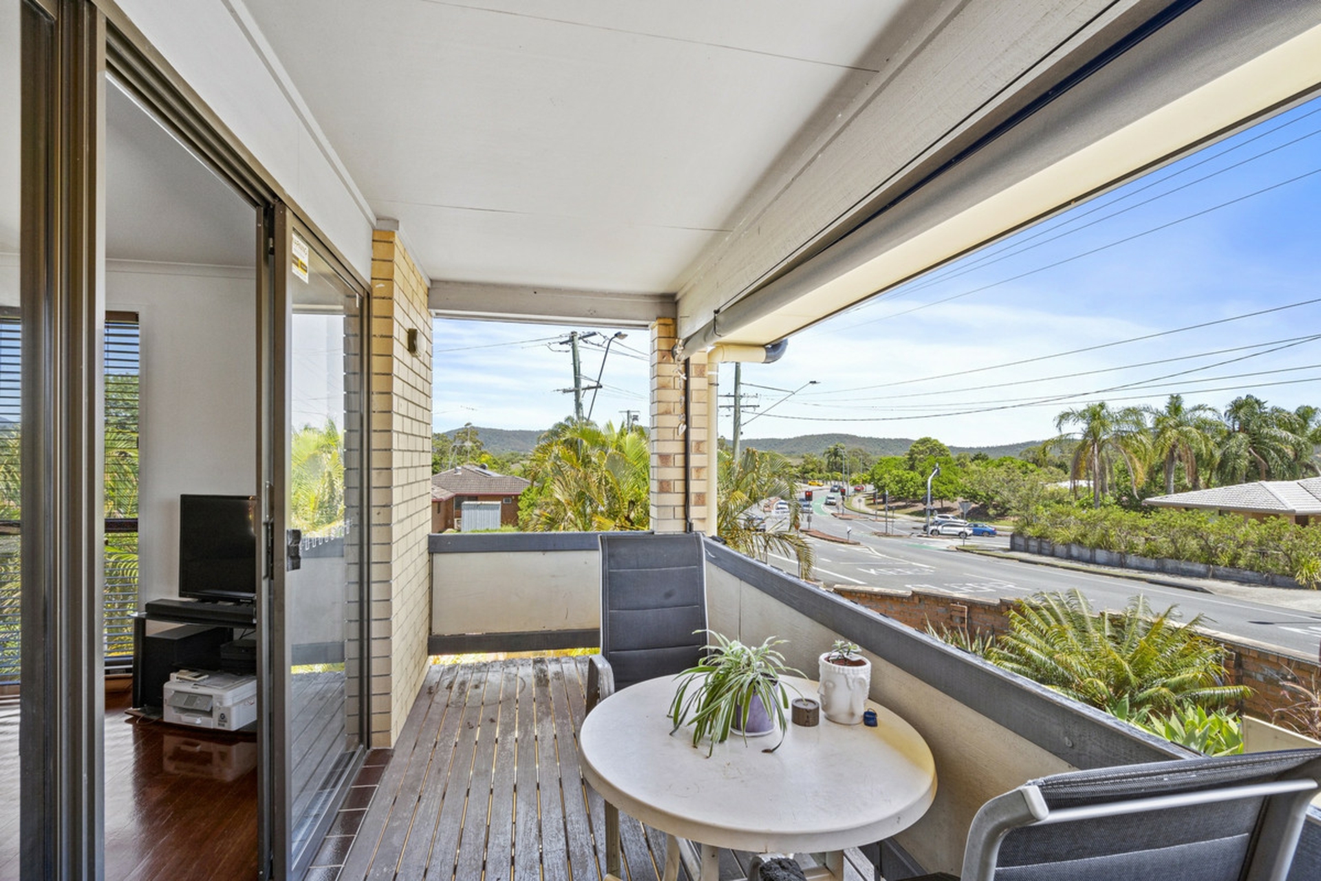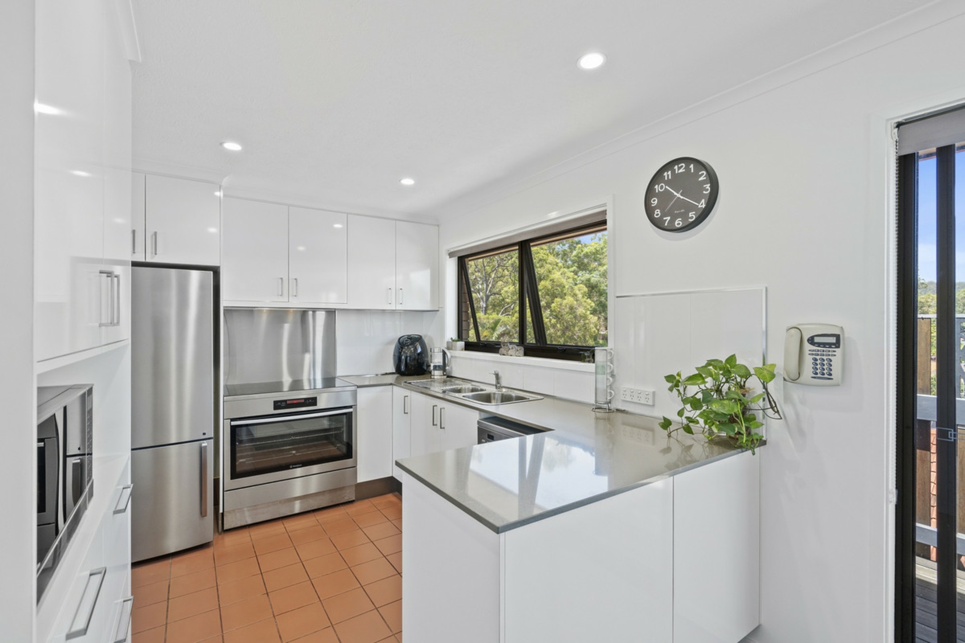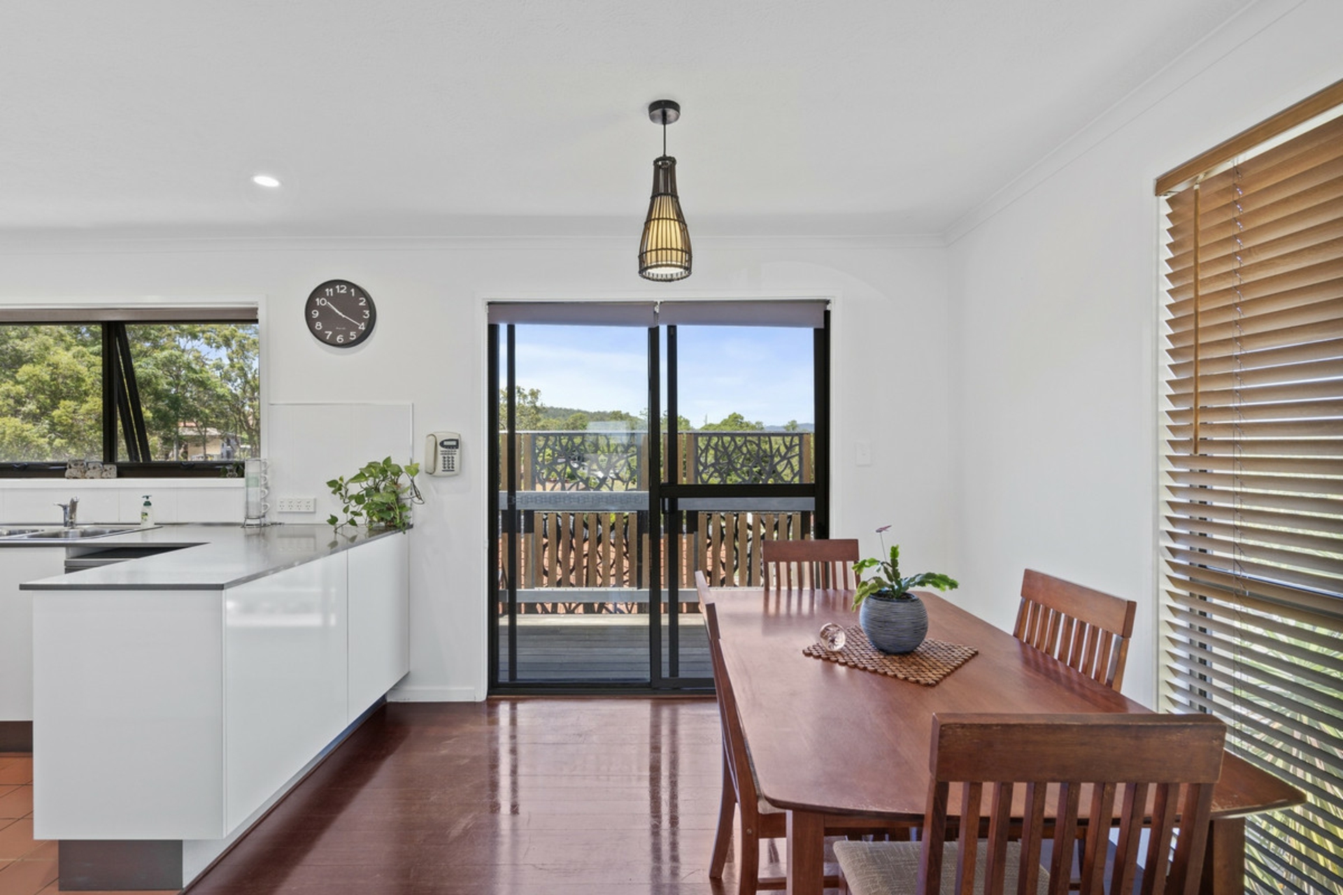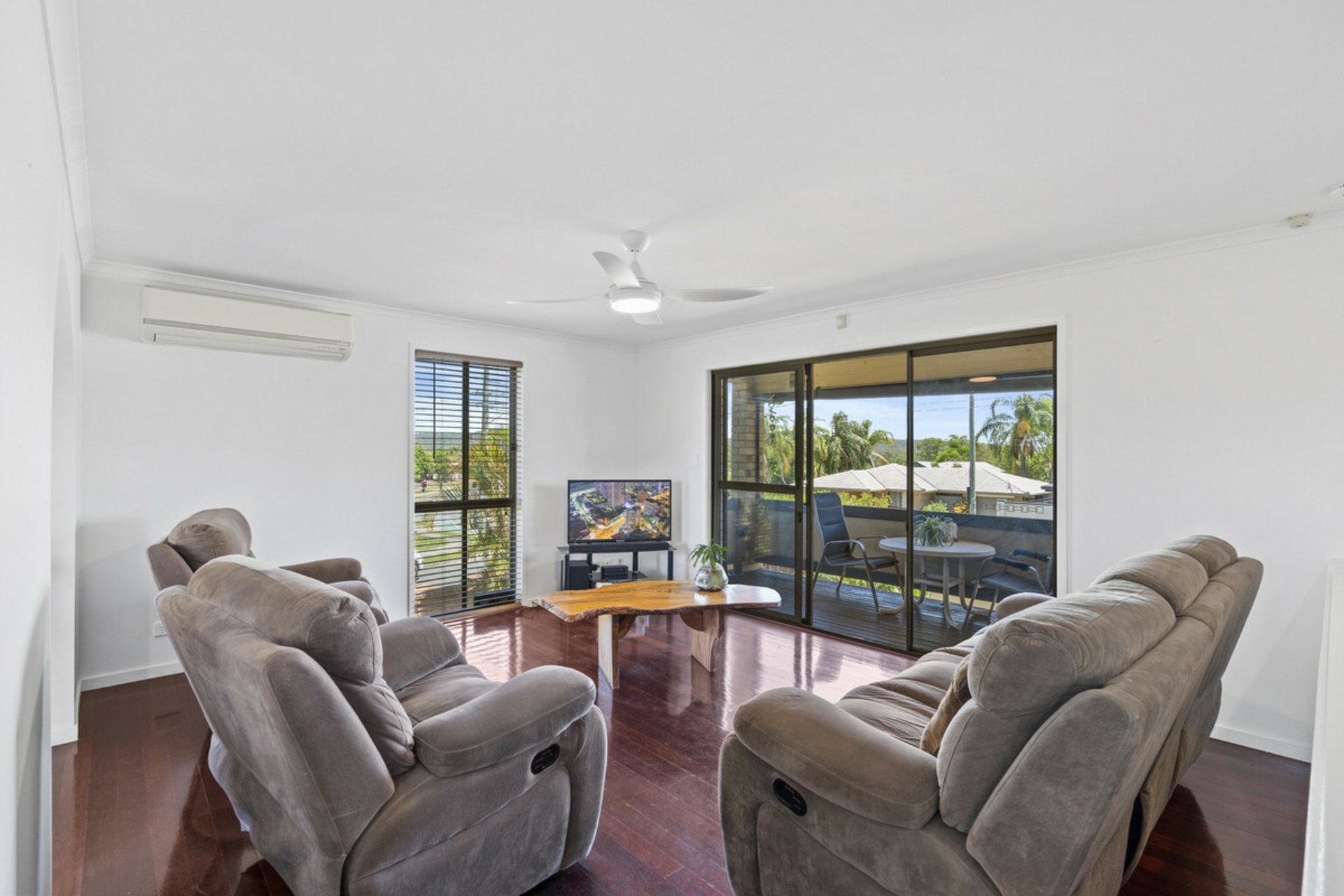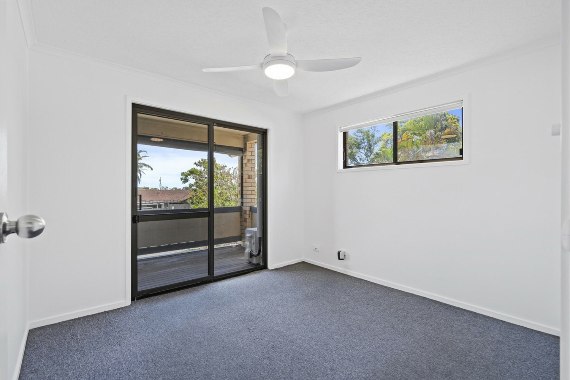 Open plan living upstairs with front balcony access from main living and two of the bedrooms