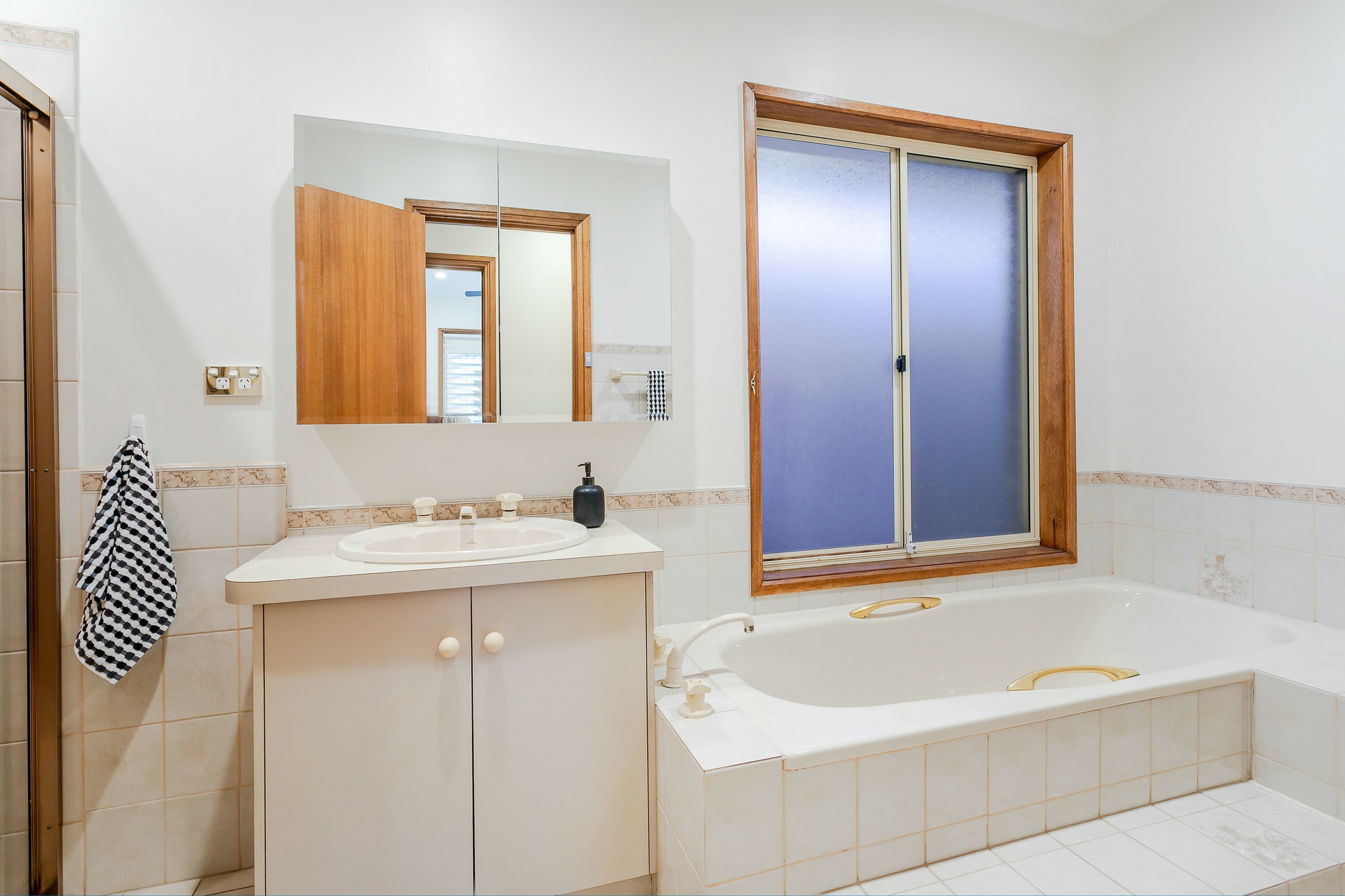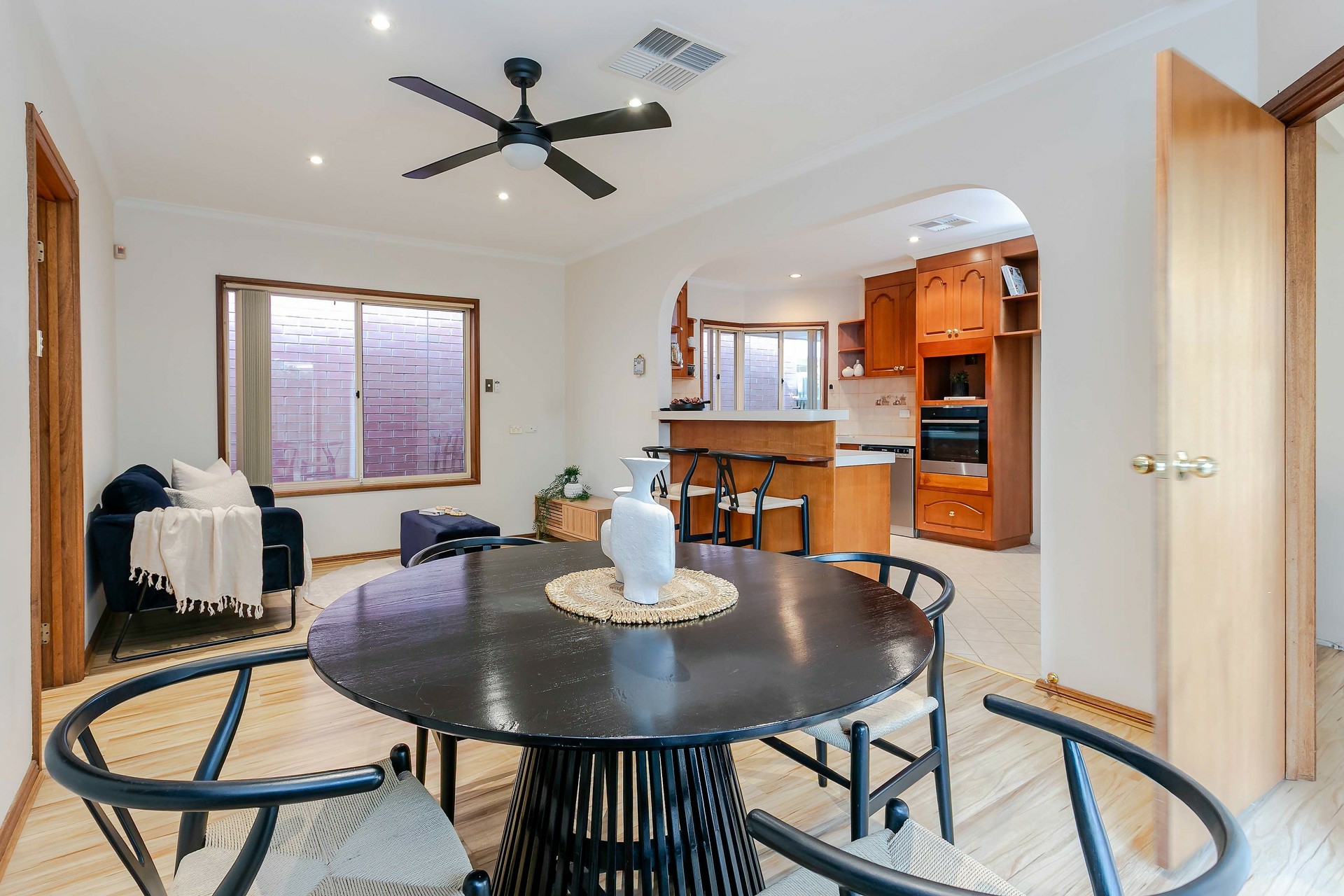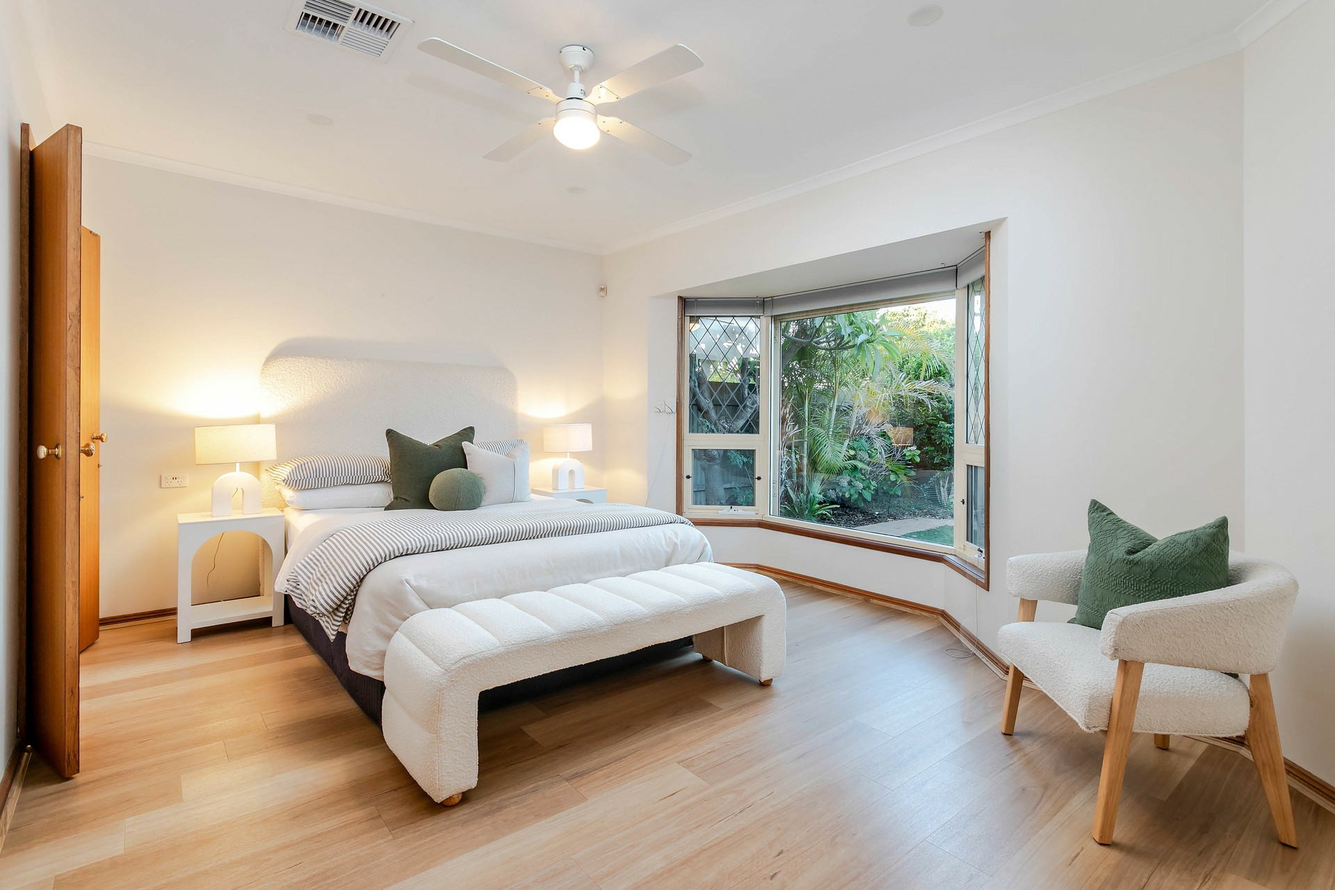 Accommodation includes three generous bedrooms with ceiling fans. The master bedroom is positioned at the front of the home and features a bay window, walk-in robe and an ensuite with excellent storage. Bedrooms two and three include built-in wardrobes and are serviced by a central bathroom with a bathtub and separate WC.