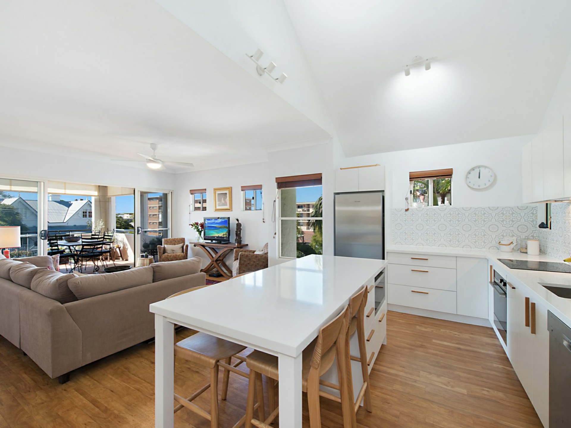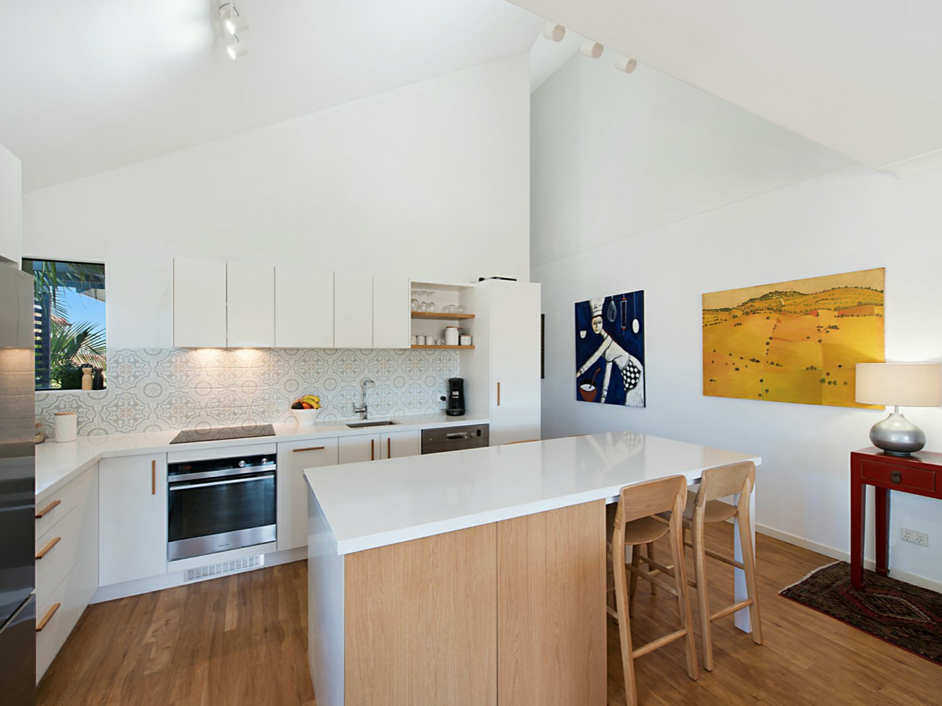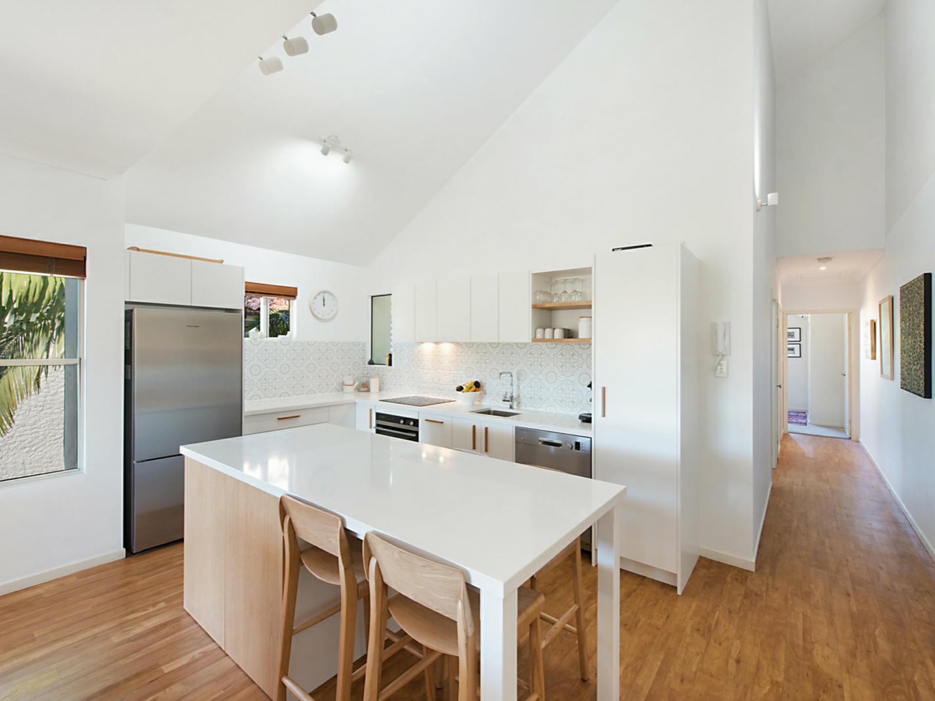An island bench which incorporates a seating area, separates the brand new, L-shaped kitchen featuring vaulted ceiling, decorative tiled splashback, polished stone bench, 2 pac cupboards, soft closing drawers and timber details; an elegant and functional kitchen with stainless steel appliances for easy maintenance.