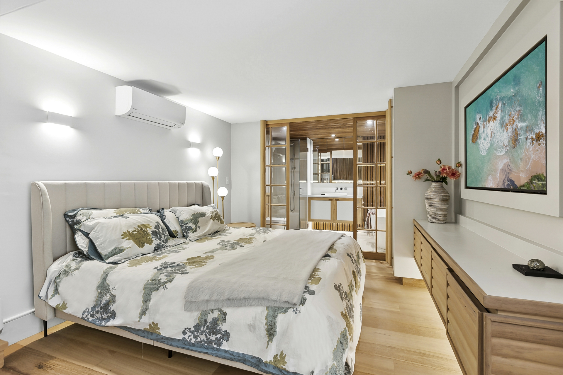 Multiple levels of stylish accommodation are connected by an internal lift from the garage to all floors. The master bedroom is a true retreat, reminiscent of the Huka Lodge in New Zealand, with soaring eight metre ceilings, floor to ceiling windows, and captivating treetop and water panoramas that are luminous even on a rainy day. A fully self contained guest apartment provides versatility for multi generational living, long term guests or a work from home haven.