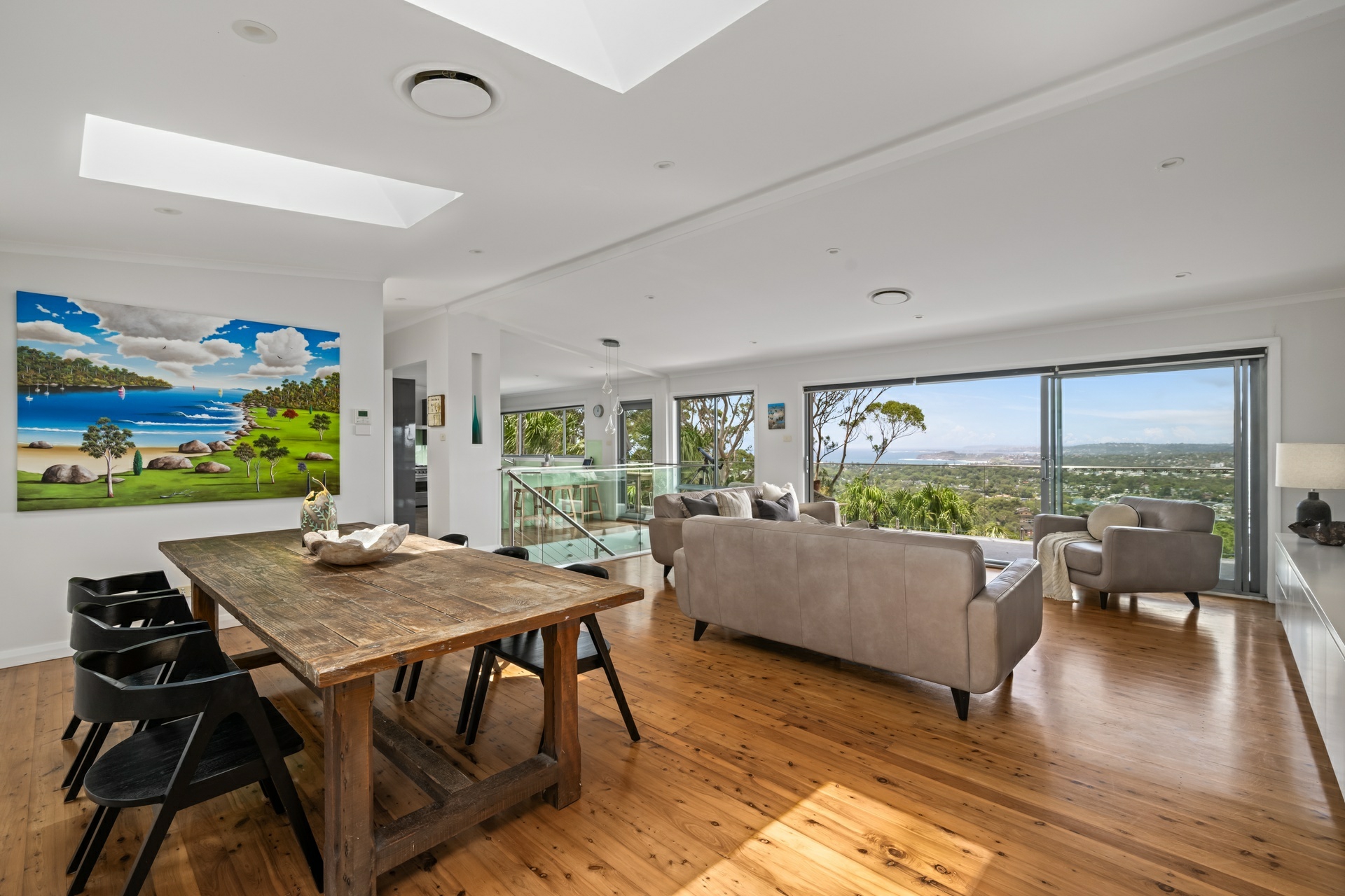 -Raked ceilings, timber floors, skylights and pendant lighting