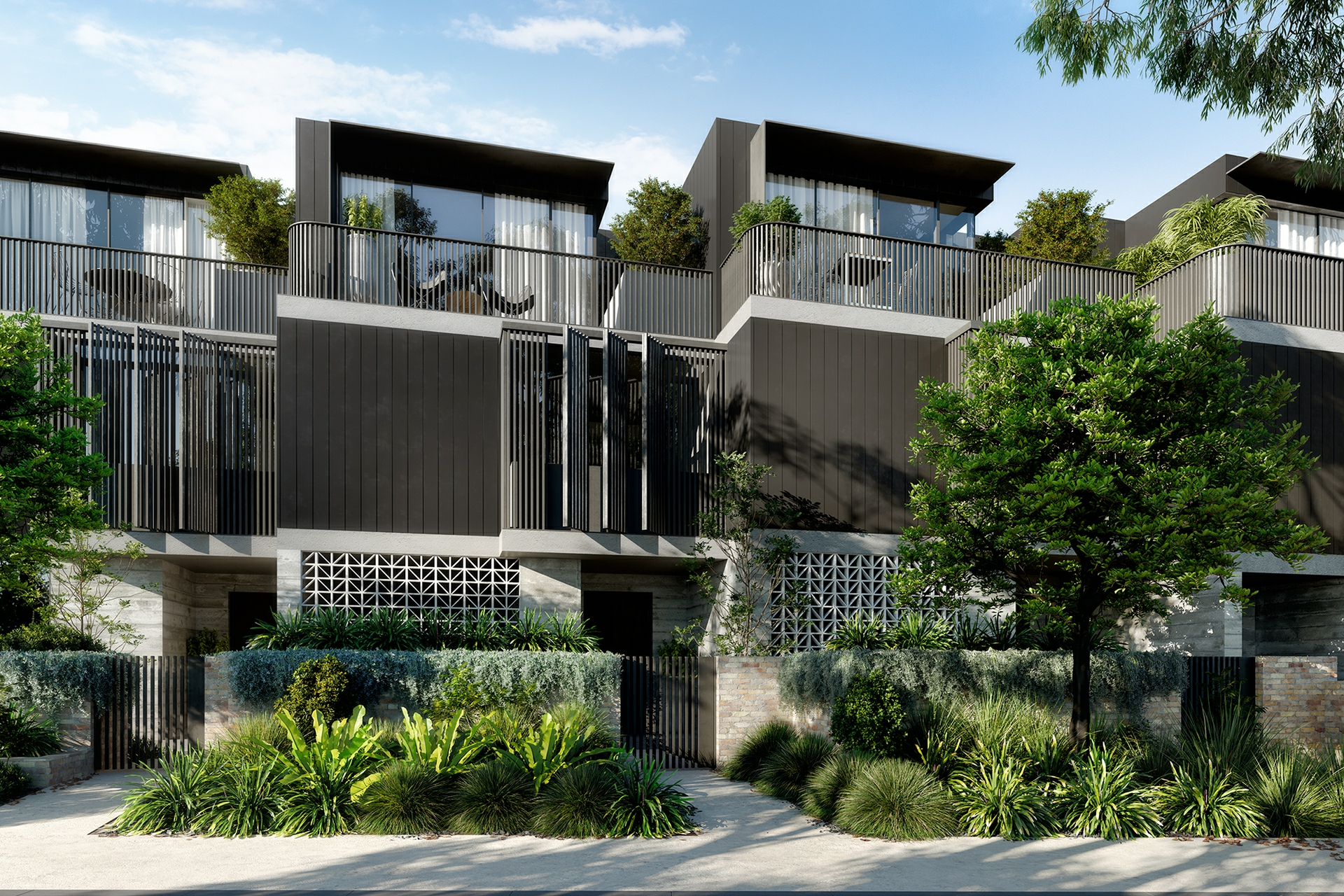Each villa consists of 3 generous oversize bedrooms plus study, complemented by 2.5 sophisticated bathrooms. Throughout the project there are generous balconies, courtyards and areas of thoughtful landscaping which combine to provide ample private open space, whilst enhancing the architectural expression of each villa. And, as you would expect, each residence has a large, secure, double lock up garage.