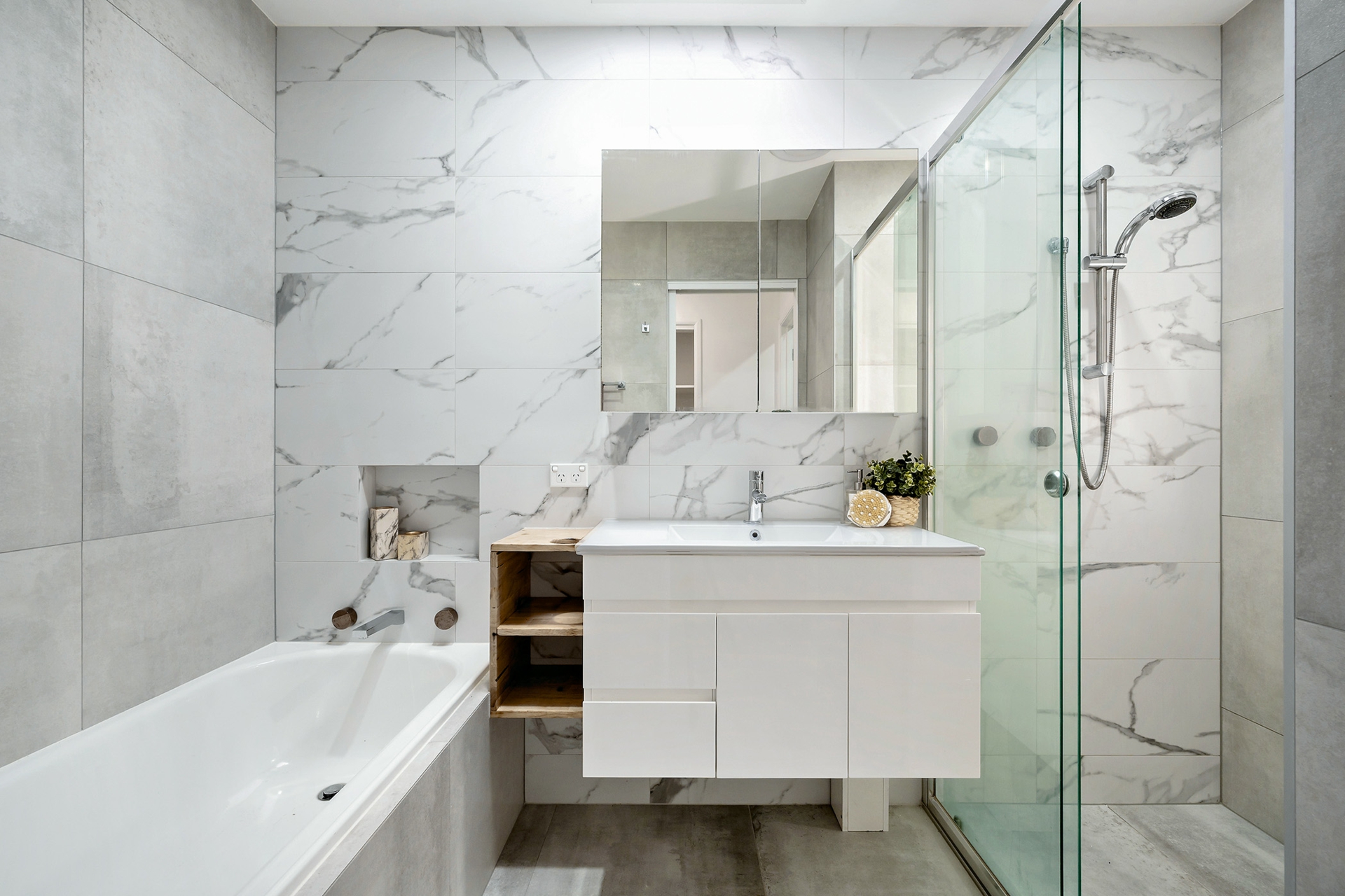 The main bathroom sits centrally to the other bedrooms and follows the same thoughtful design, with textured finishes and a separate toilet close by for everyday practicality.