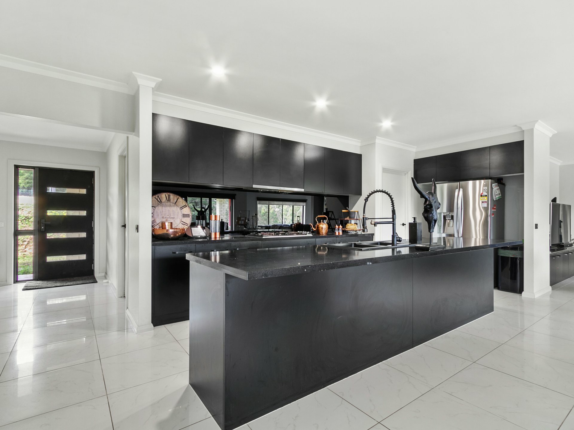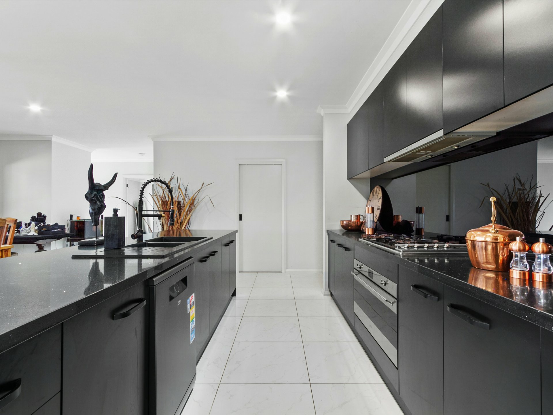 The highlight of the home is a massive central kitchen showcasing elegant black stone benchtops, a butler’s pantry, a second pantry, and sleek appliances- a delight for culinary enthusiasts. The dining room seamlessly flows through stacker doors to a large undercover alfresco area, perfect for enjoying the afternoon sun. Two spacious living areas provide ample room for relaxation, complemented by a study nook.