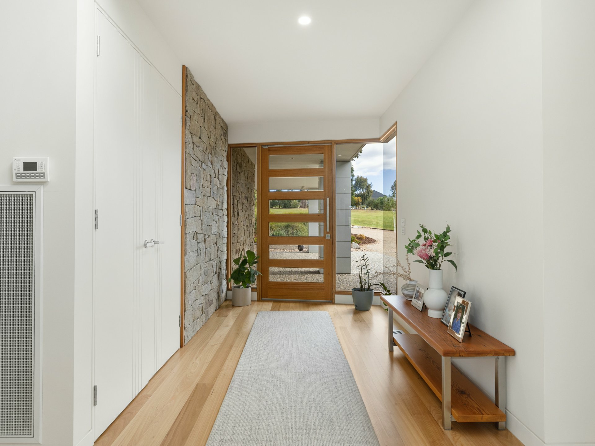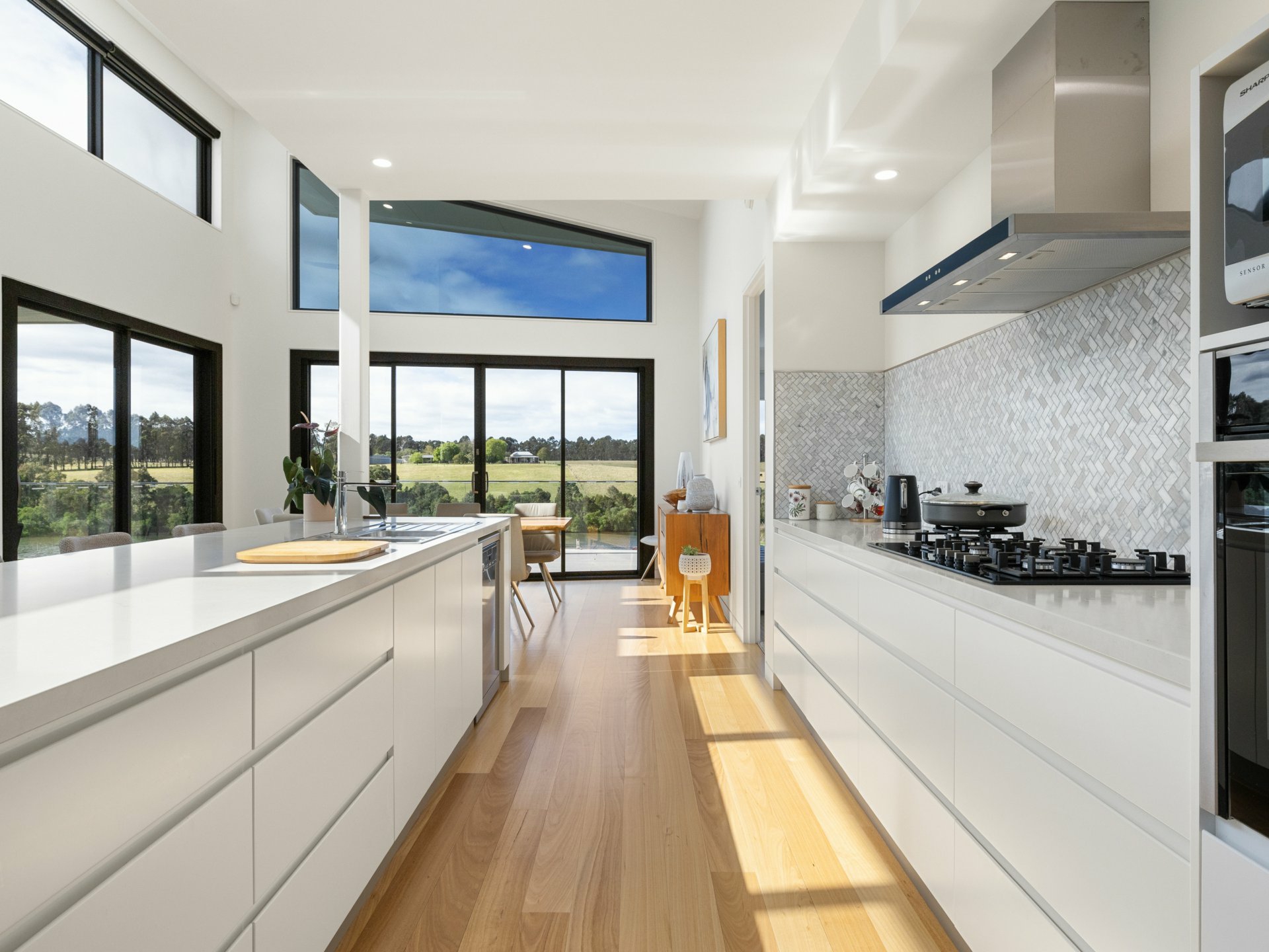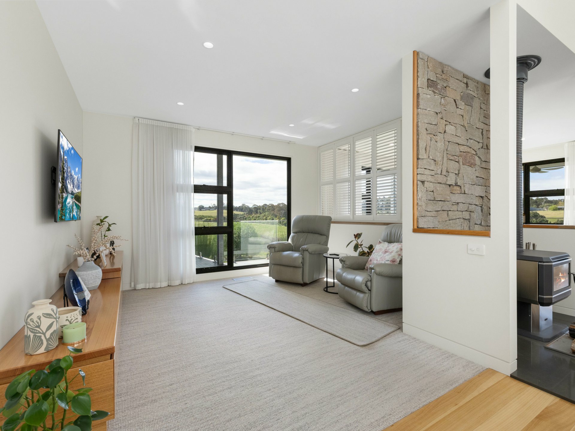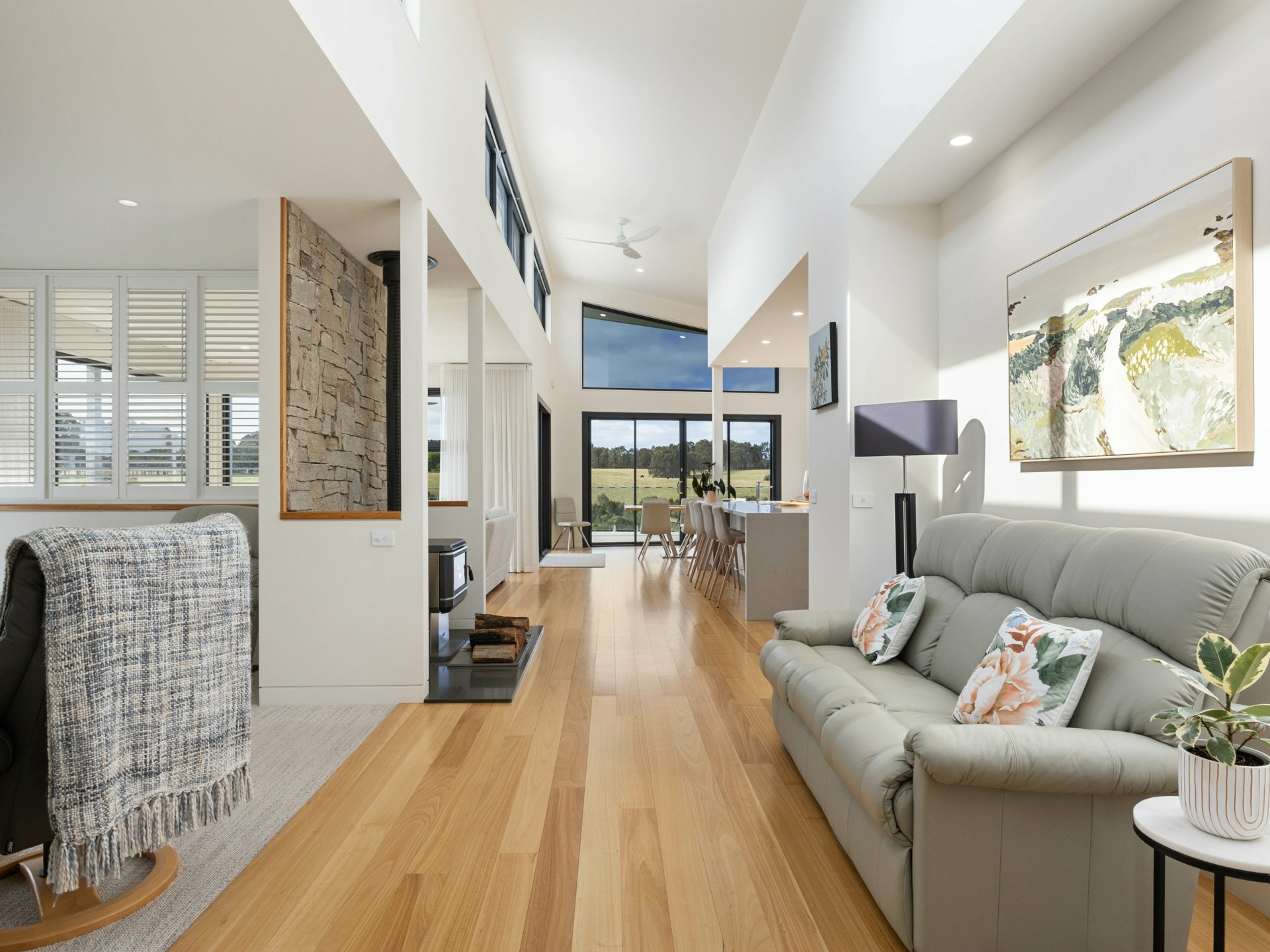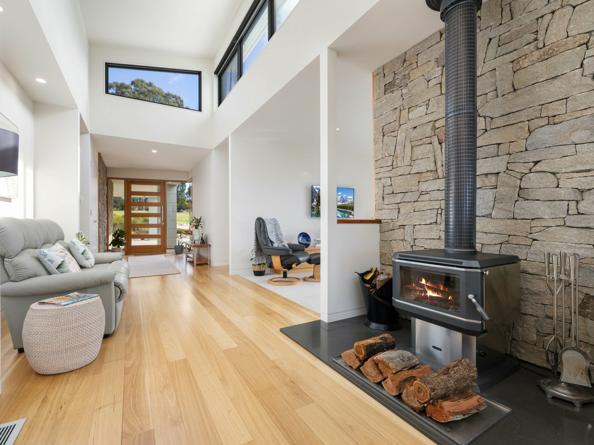 The kitchen is a true centrepiece with stone benchtops, Bosch gas hotplates, a Neff electric oven and range hood, plus a Miele dishwasher. Celestial windows open at the touch of an electronic keypad, bringing the outside in, while a walk-through butler’s pantry provides additional convenience. Polished hardwood timber floors add character and warmth, complemented by a Coonara wood heater and a Daikin zoned reverse cycle system for year-round comfort. Bedrooms feature plush wool carpets and ceiling fans, while wet areas are finished with quality tiling.