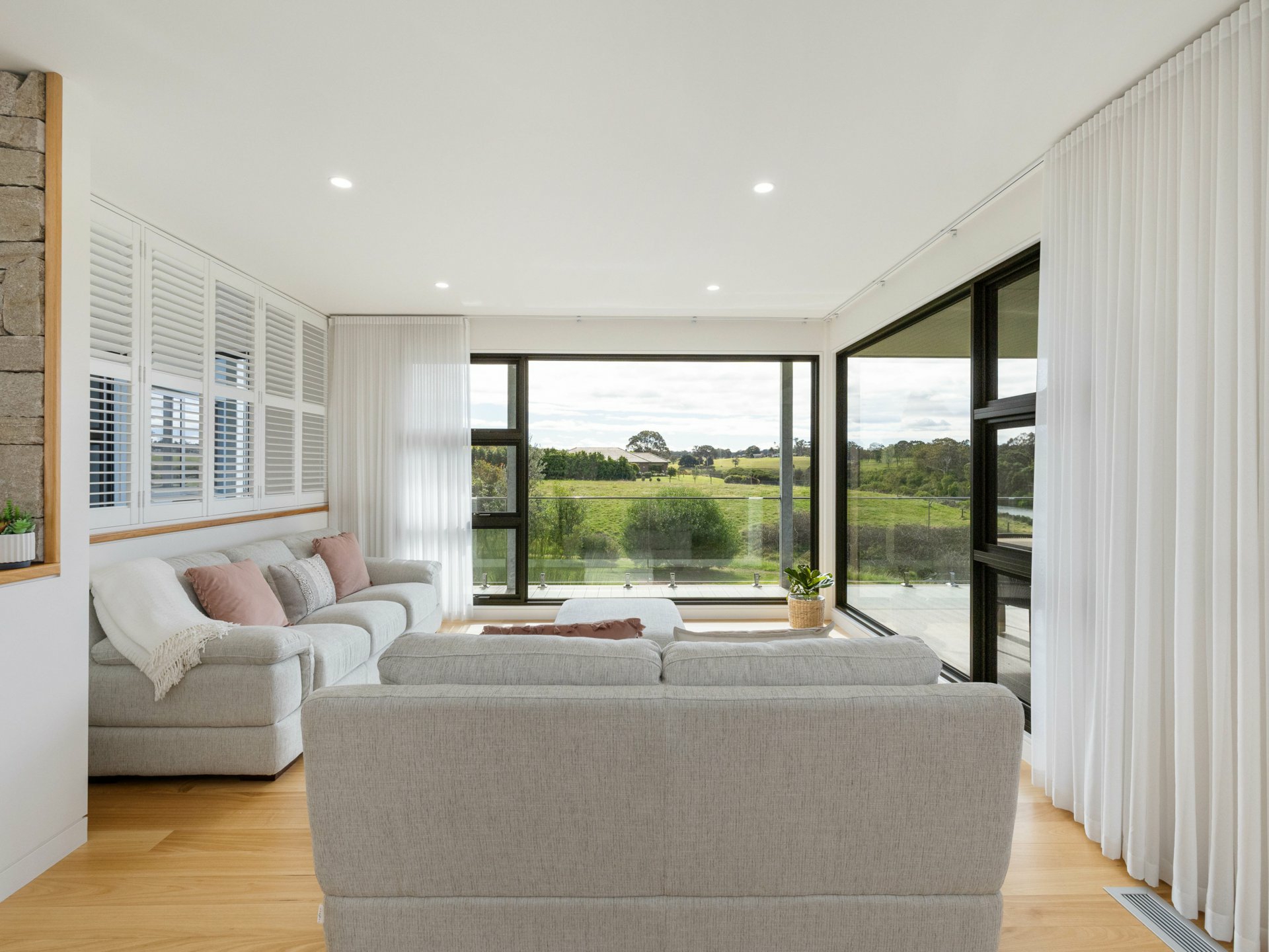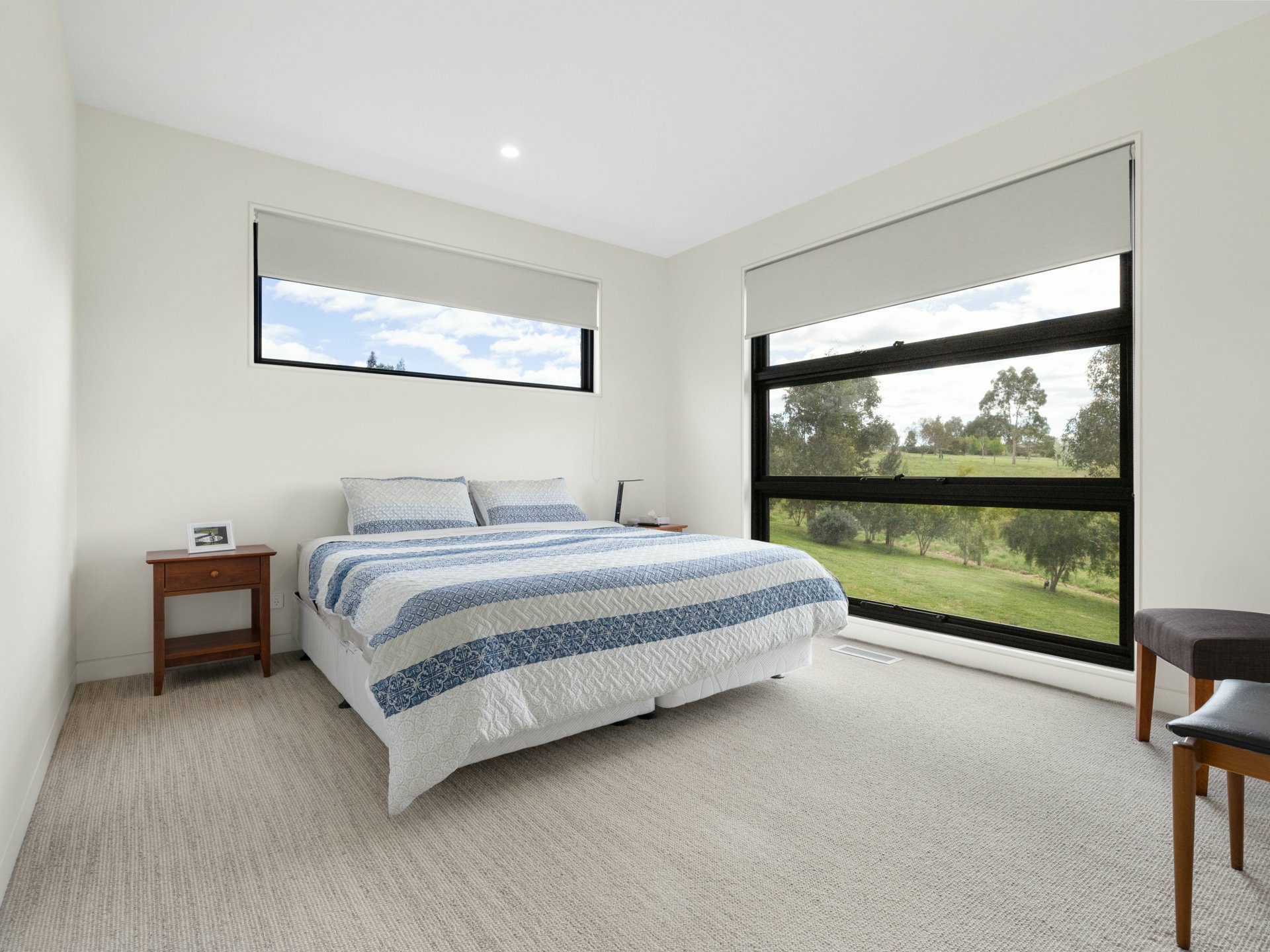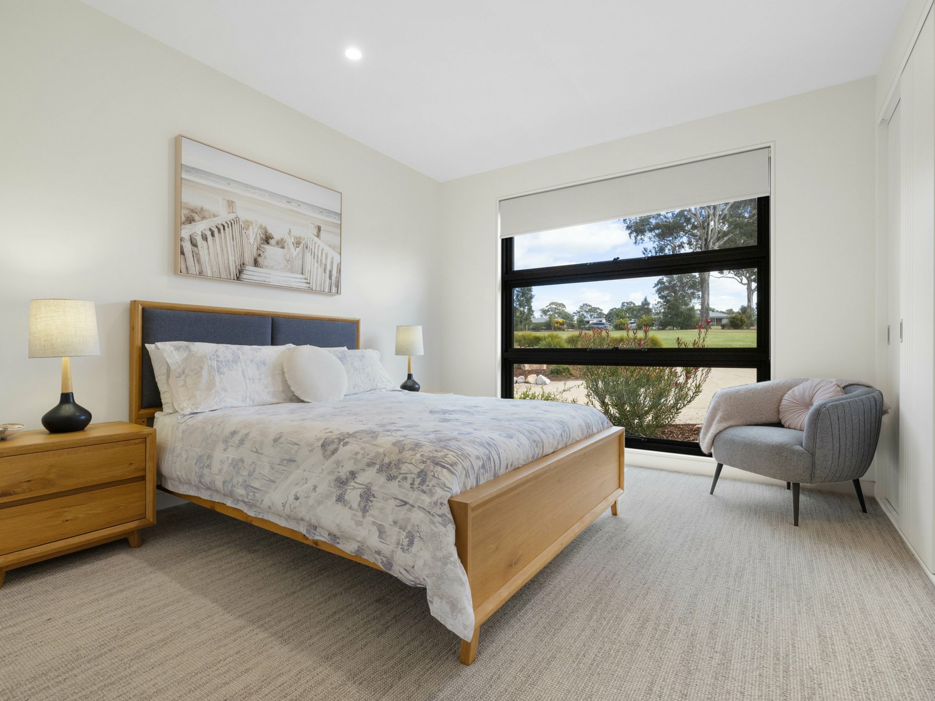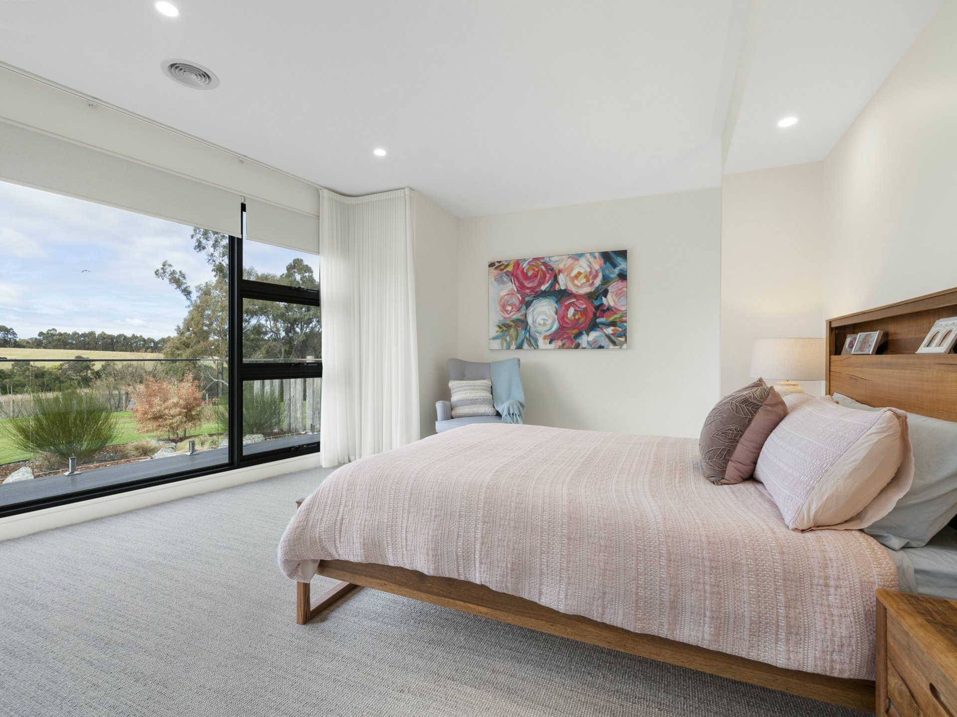 The kitchen is a true centrepiece with stone benchtops, Bosch gas hotplates, a Neff electric oven and range hood, plus a Miele dishwasher. Celestial windows open at the touch of an electronic keypad, bringing the outside in, while a walk-through butler’s pantry provides additional convenience. Polished hardwood timber floors add character and warmth, complemented by a Coonara wood heater and a Daikin zoned reverse cycle system for year-round comfort. Bedrooms feature plush wool carpets and ceiling fans, while wet areas are finished with quality tiling.