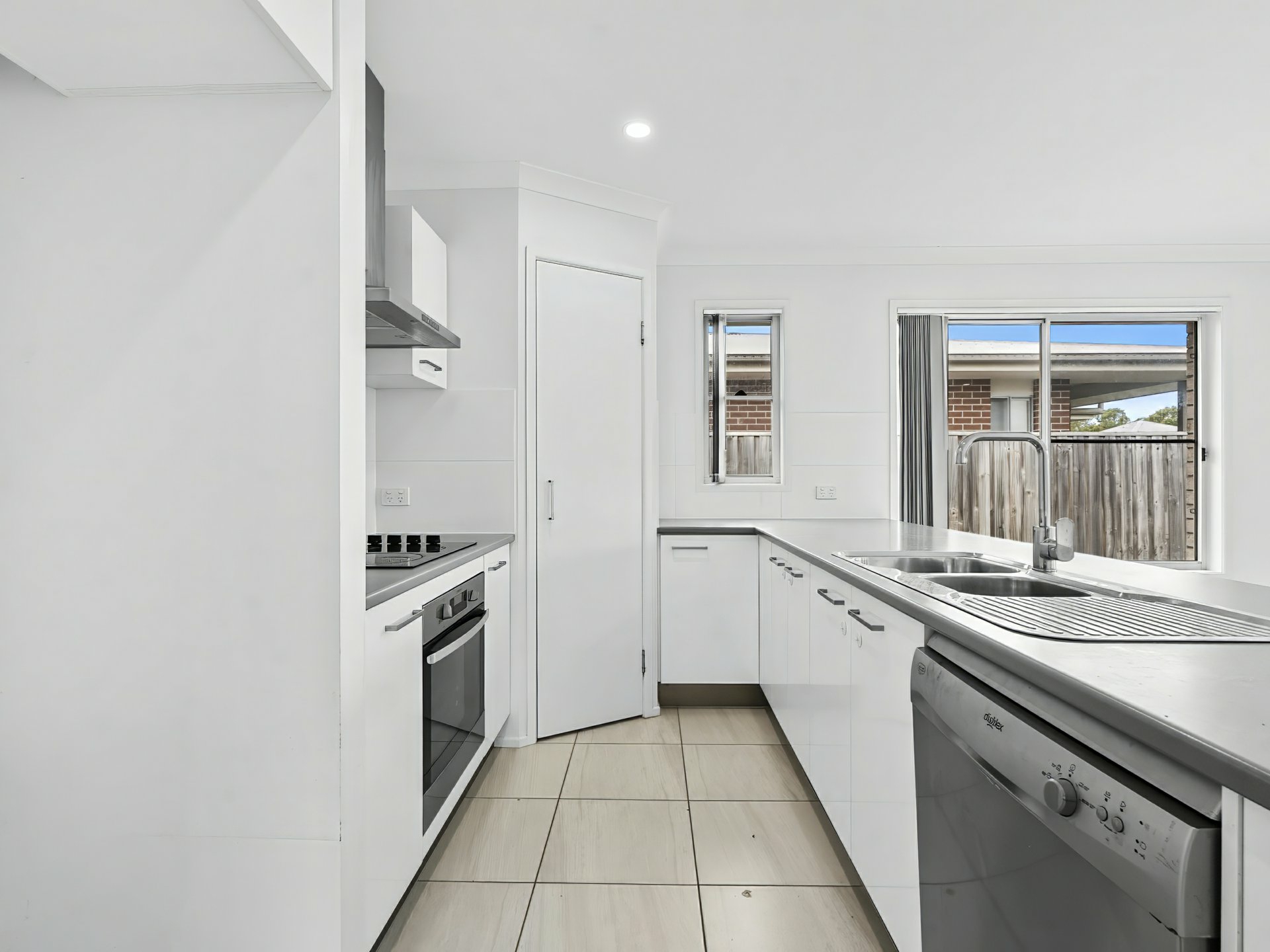 Towards the rear, the home opens into a light-filled open plan kitchen, dining, and lounge area, perfect for modern family living and entertaining. The kitchen is well-equipped with an electric stove, oven, dishwasher, and ample storage, all overlooking the backyard.