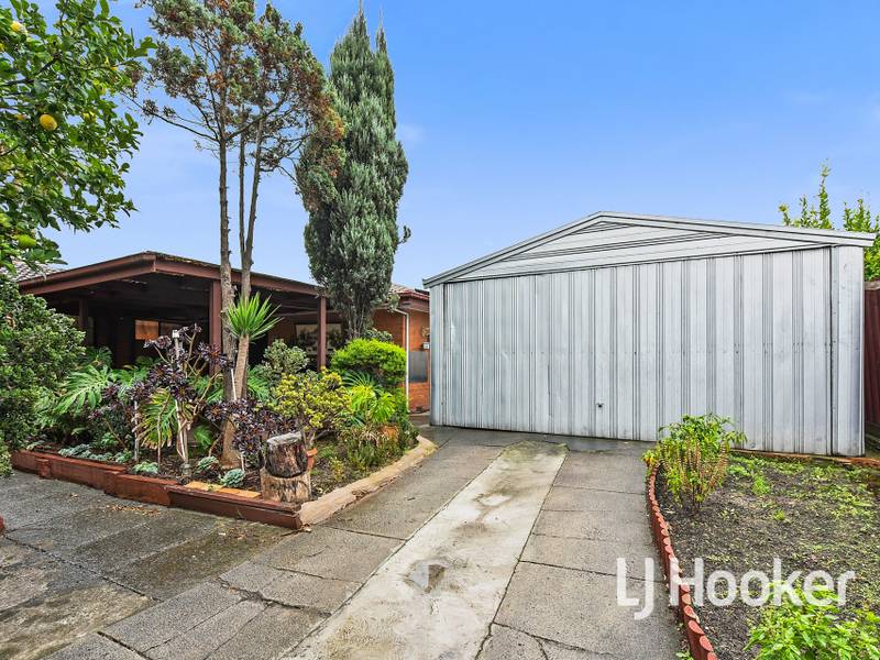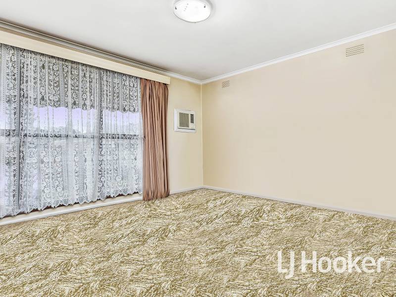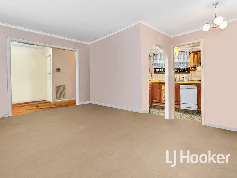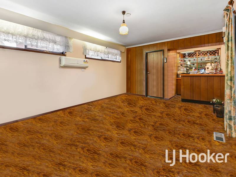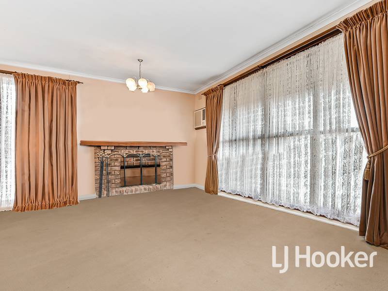 A traditional brick veneer triple-fronted facade is securely and privately accessed beyond the perimeter wall, while a double lock-up garage faces the secondary street. Entry is via a covered portico and into an L-shaped open-plan living/dining room, bathed in natural light. High, white ceilings, decorative pendant lights and soothing beige walls characterise a space which is fully carpeted and offers a brick fireplace adorned by a timber mantelpiece.