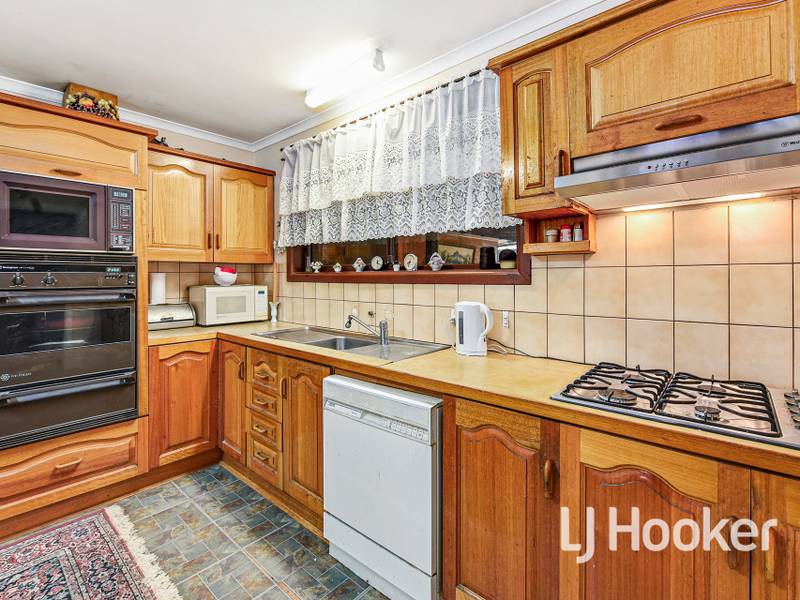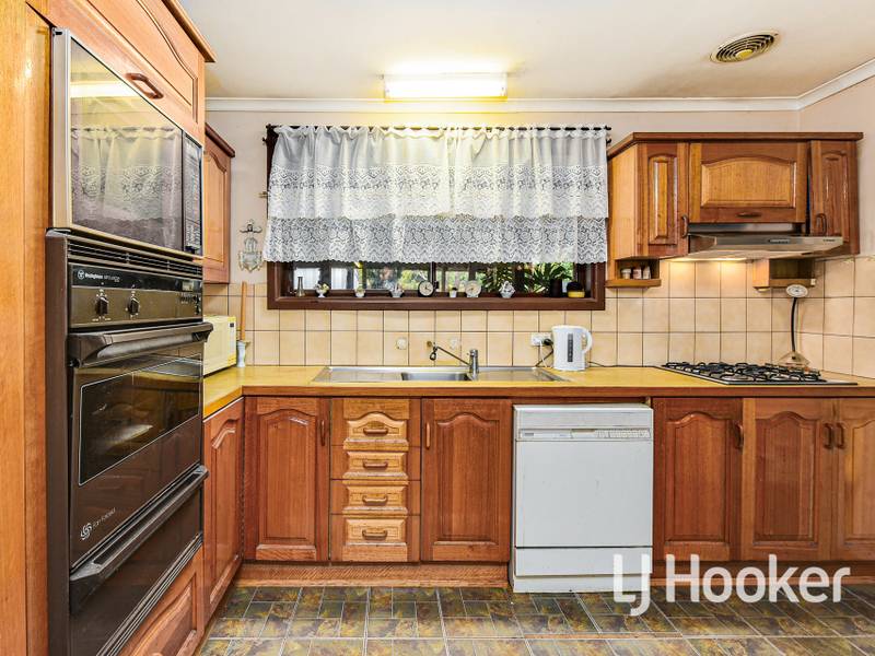 Separating the main living from a spacious rumpus boasting access to a large covered and fully tiled pergola (and vaunting its own private bar), is the heart of the home, the kitchen. Dressed in solid timber ornate shaker cabinetry, this space promotes nostalgic vibes and is lit by fluorescent lighting. Quality Westinghouse appliances are included, such as the wall-mounted electric oven and the new 600mm gas burner cooktop and a double bowl sink is positioned below a large sliding window.